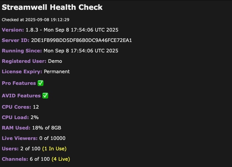 Streamwell provides an API endpoint that allows you to check the health of the server and some other helpful statistics ๐ฉบ