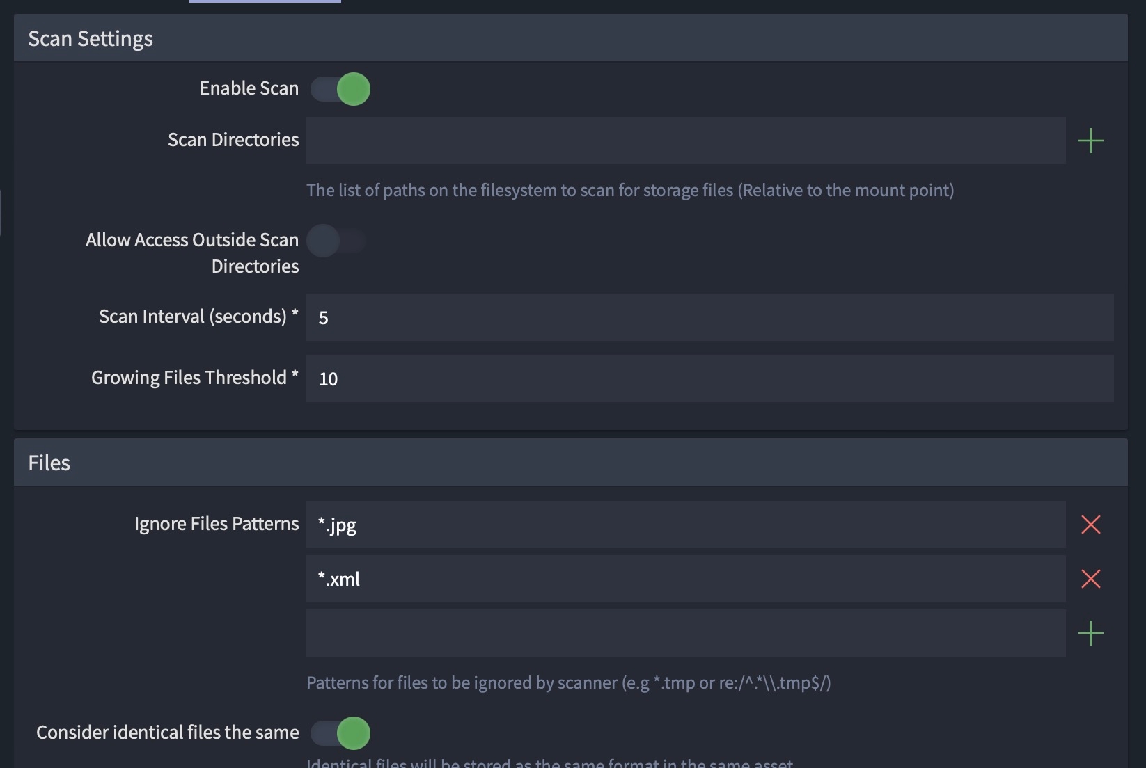 Under Scan settings, create 'Ignore Files Patterns' as shown: "*.jpg" and "*.xml" - this will prevent the sidecar metadata and thumbnail files from being ingested as clips into Iconik (unless you want them there, in which case go nuts).