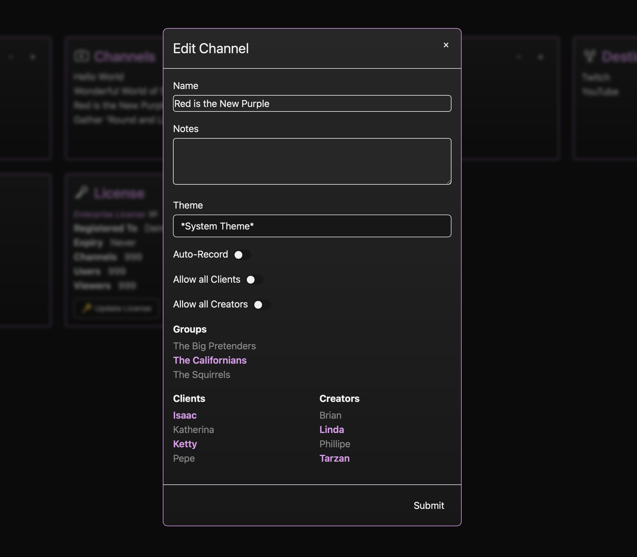 Each channel is a private workspace centered around a live stream. Every channel has a name, some optional notes, a theme (the system theme is the default) and a list of allowed Groups, Clients and Creators. This can be edited to allow/revoke access to channels as needed, or to enable automatic recording.