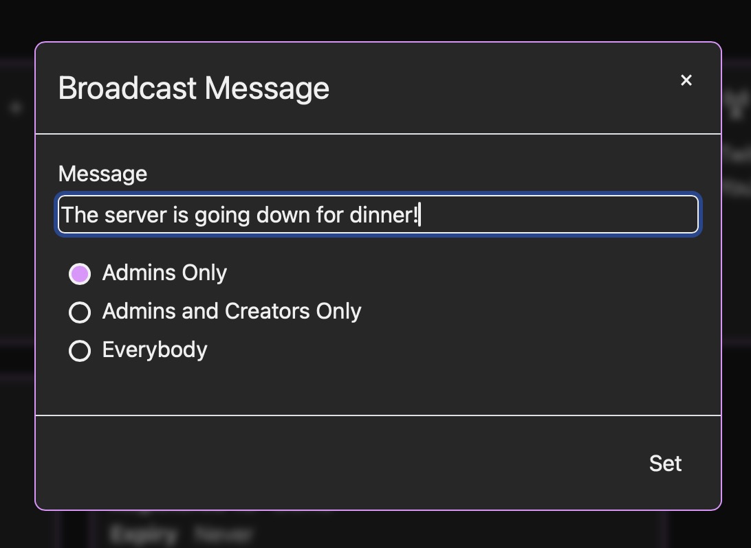 **Broadcast Message** - send an instant pop-up message to everybody on the server, or just Admins/Creators only. Handy if you need to make a company-wide announcement. (This uses the "Server Messages" feature which is off by default.)