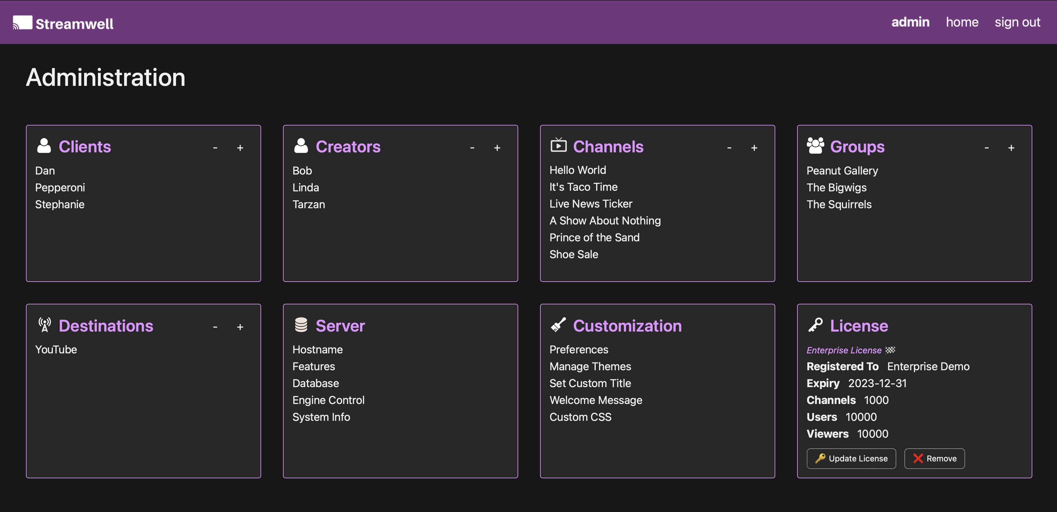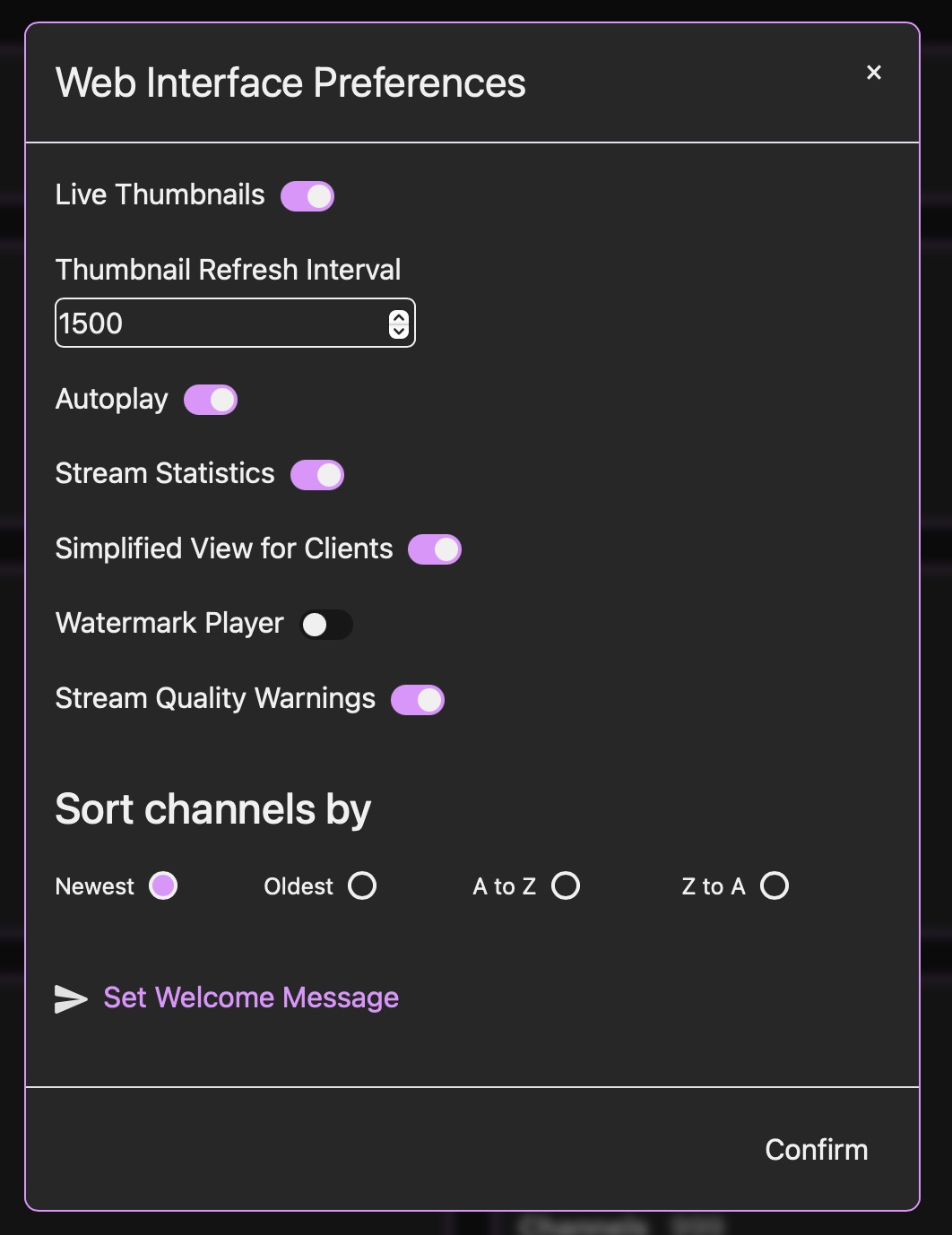 The preferences panel lets you change the look and behaviour of the web interface. You can decide on visual features like live thumbnails on the home screen, watermarking options, the channel sort order, and whether clients see chat/file upload modules or just the stream. You can also set a custom welcome message, shown whenever users log in.