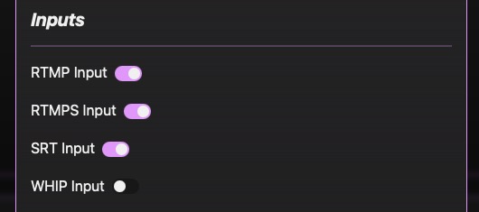 The ***Inputs*** section lets you choose which stream protocols the server will accept. Note: RTMPS and WHIP will only function over secure connections.