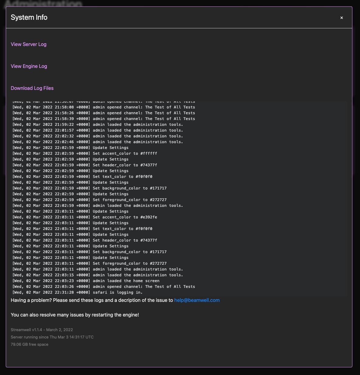 An easy way to view the Server and Engine logs in the browser, or download them if you need to send them to support. You can also see how long the server has been running, which version is installed and how much disk space is left on the system drive.