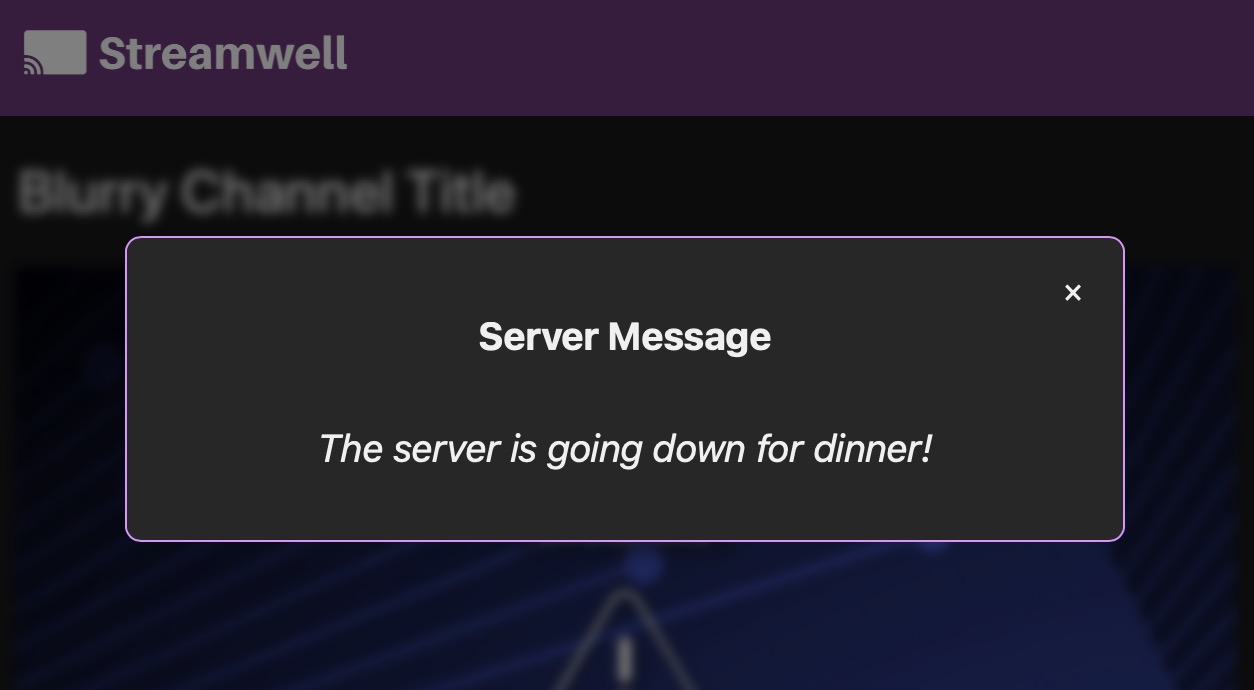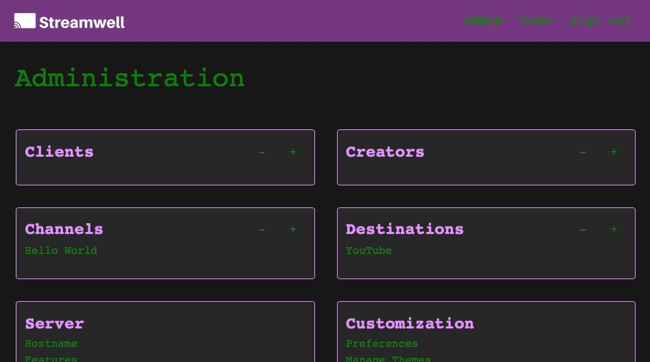 Themes allow you to set a different look and feel for each channel individually. Choose 'Manage Themes' to change either the default (system) theme or create new themes for use across channels of your choosing. When creating or editing a channel you can then switch the theme as needed. Note that logo files must be PNG images and backgrounds must be JPG images, with a maximum size of 500KB each - remember, people will be loading these images when they visit your Streamwell server so smaller is always better!