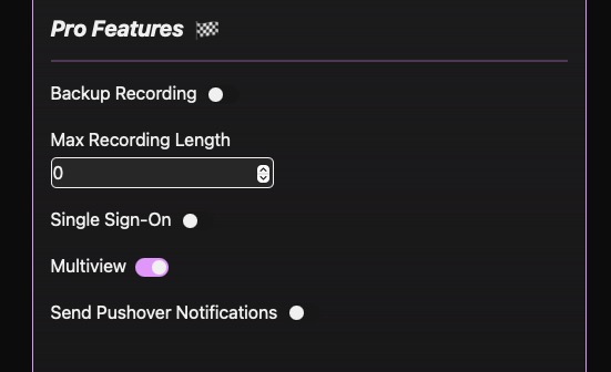 The ***Pro Features*** section lets you activate certain Pro Features like [Single Sign-On](https://docs.streamwell.net/pro-features/single-sign-on), [Multiview](https://docs.streamwell.net/pro-features/multiview), [Backup Recording](https://docs.streamwell.net/pro-features/backup-recording), and [Push Notifications](https://docs.streamwell.net/pro-features/push-notifications). It also lets you set a global maximum length (in minutes) for all recordings, to prevent situations where somebody walks away from a live stream and fills up your entire corporate shared storage!