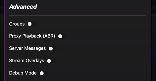 The ***Advanced*** section lets you activate extended features such as [Groups](https://docs.streamwell.net/users-and-groups#groups), [Proxy Playback](https://docs.streamwell.net/more-information/advanced-configuration#proxy-streaming-abr), [Server Messages](#features), [Stream Overlays](#stream-overlays), and Debug Mode. **Note:** when you activate debug mode, the Engine will restart and any live streams will be interrupted.