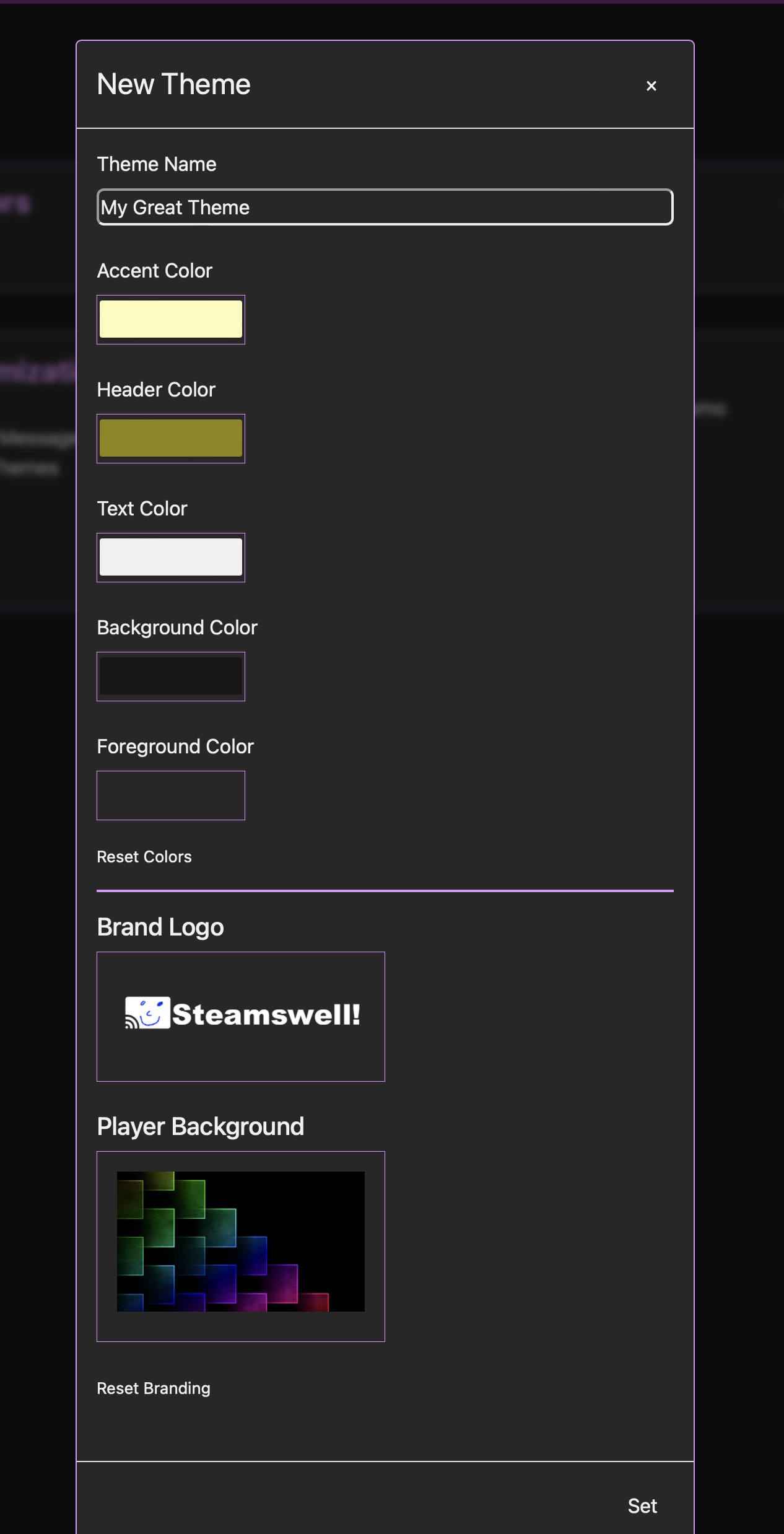 Provide your own custom CSS which loads after the main 'streamwell.css'. You can also use the following CSS variables to override theme preferences: *--text-color, --accent-color, --header-color, --background-color, --foreground-color*