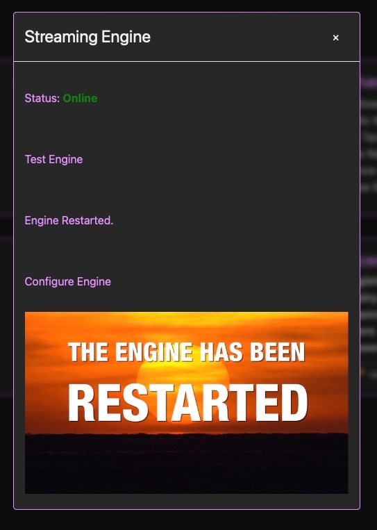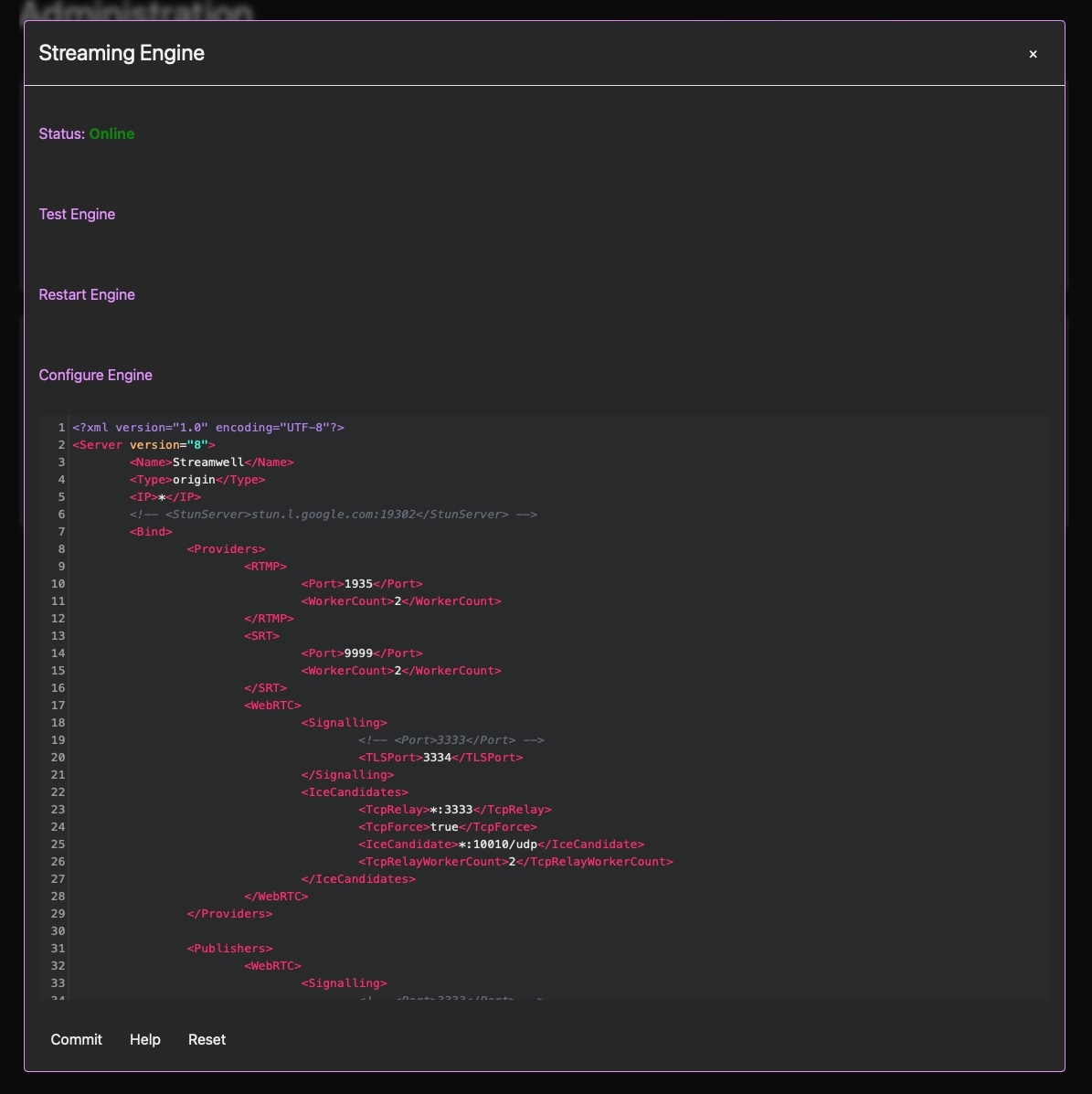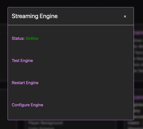 This panel lets you check the status of the streaming engine, as well as testing it, restarting it, and even manually editing the configuration (be careful with the config editor. It's mostly intended for use by support or pro services).