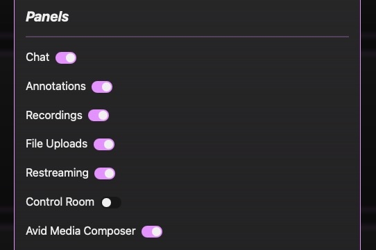 The Panels section lets you choose which collaborative features you want to use in Streamwell. Certain features like Avid Media Composer are only available with an appropriate license.