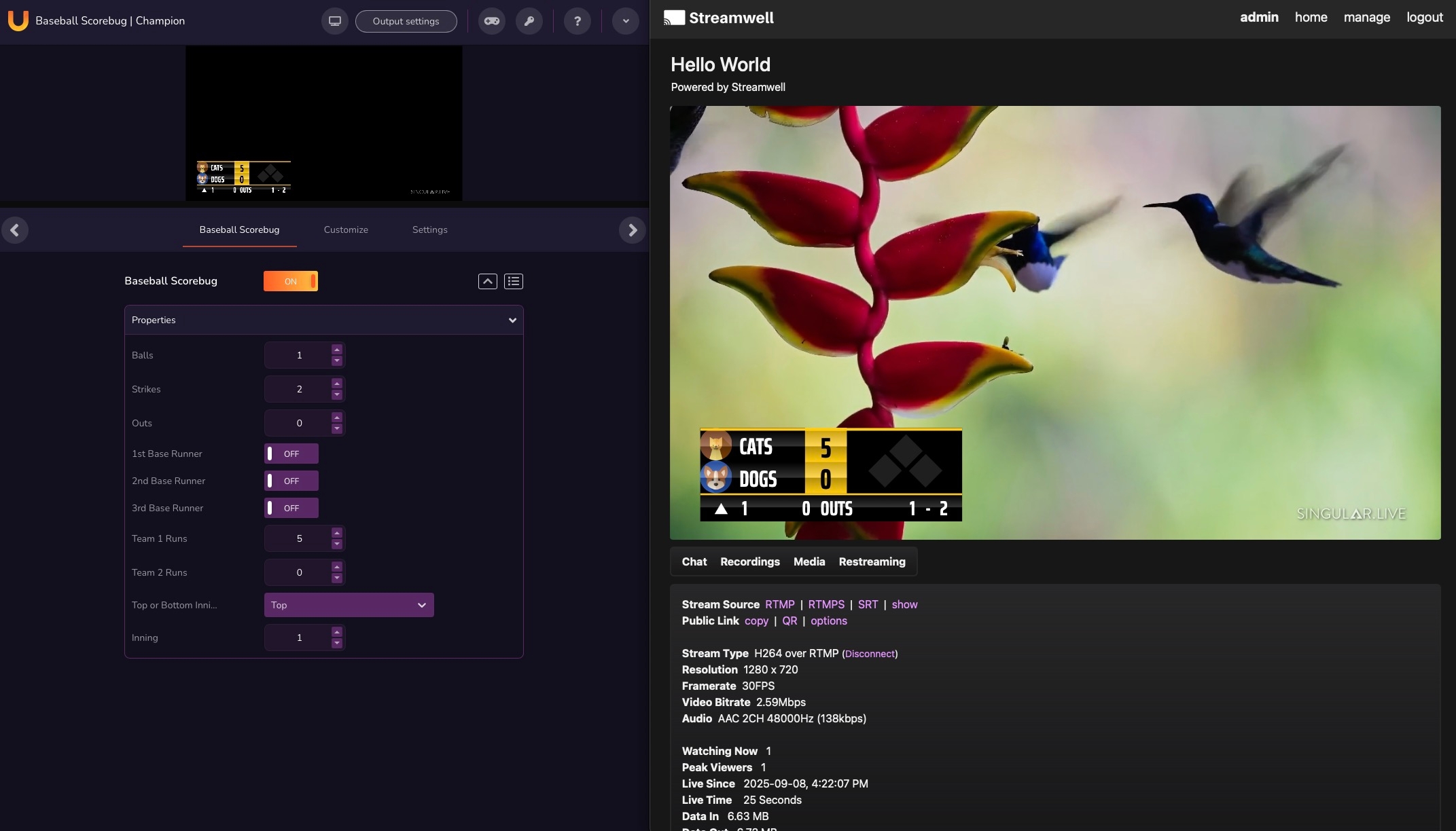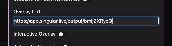 This lets you embed additional graphics or info right on top of the Streamwell player, from a live graphics service like singular.live. Check 'interactive overlay' to make the contents of the overlay clickable. You could even use this to place a third-party video player into Streamwell!