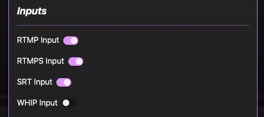The Inputs section lets you choose which stream protocols the server will accept. Note: RTMPS and WHIP will only function over secure connections.