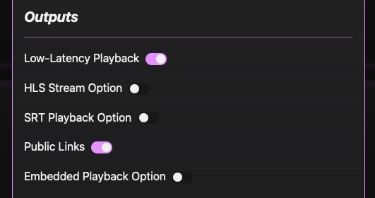 • Low-Latency Playback - use ultra low-latency WebRTC to provide sub-second latency to viewers. Turn this off to use HLS which is a buffered playback method with 2-3 seconds of latency but better resilience in challenging network conditions.