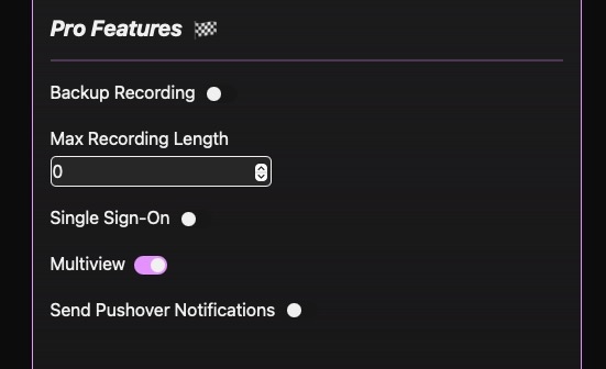 The Pro Features section lets you activate certain Pro Features like Single Sign-On, Multiview, Backup Recording, and Push Notifications. It also lets you set a global maximum length (in minutes) for all recordings, to prevent situations where somebody walks away from a live stream and fills up your entire corporate shared storage!