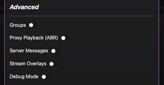 The Advanced section lets you activate extended features such as Groups, Proxy Playback, Server Messages, Stream Overlays, and Debug Mode. Note: when you activate debug mode, the Engine will restart and any live streams will be interrupted.