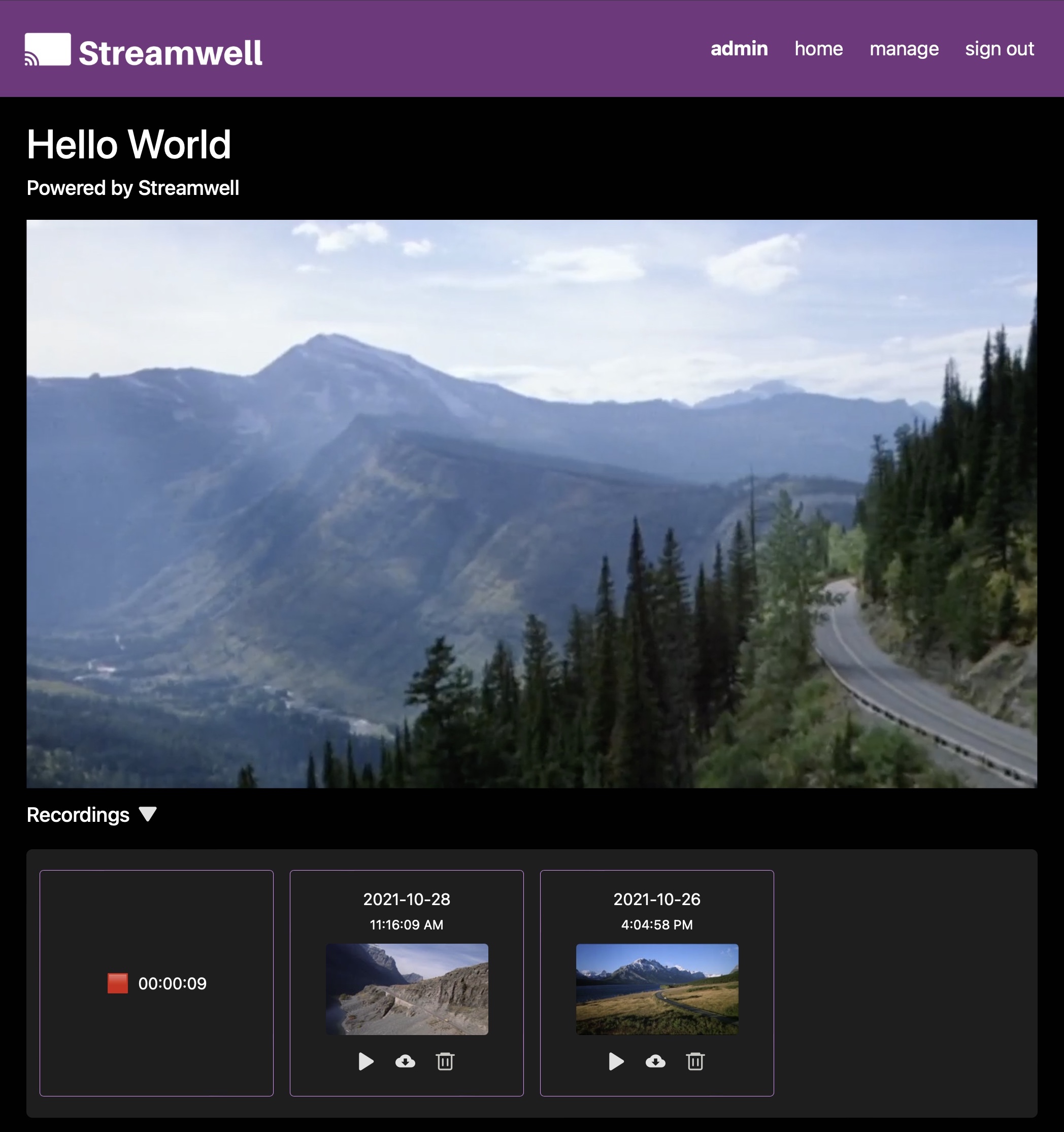 You are free to leave the page while the recording is active. When you stop the recording, it will process on the server and appear in the list once it is ready. You can then playback recordings in the browser as you please, or download them for use elsewhere. The recordings are remuxed into MP4 but not re-encoded, so the exact video data received by the server is what you will see in your recording.