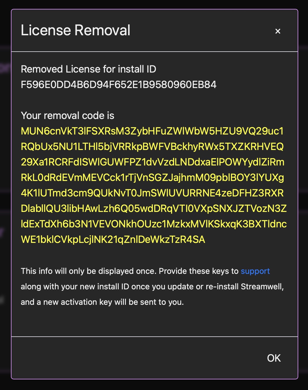 **2.** Remove your license and take a screenshot or copy of the removal code and install ID: