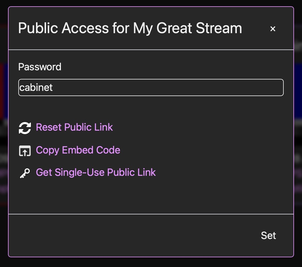 The Public Link can be copied to provide view-only access to the current stream, or within the options dialog you can click 'Copy Embed Code' to generate a small HTML snippet that can be copy-pasted into any other website if you prefer to show your stream there. Click 'Reset Public Link' and anybody watching will be elegantly dismissed, then a new public link will be generated: