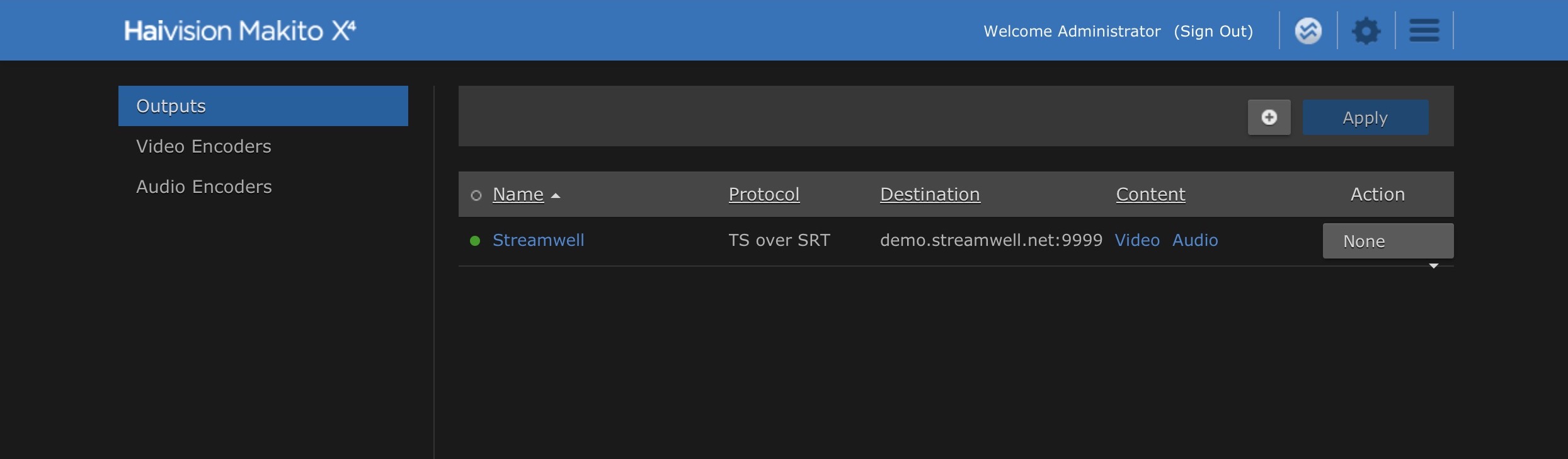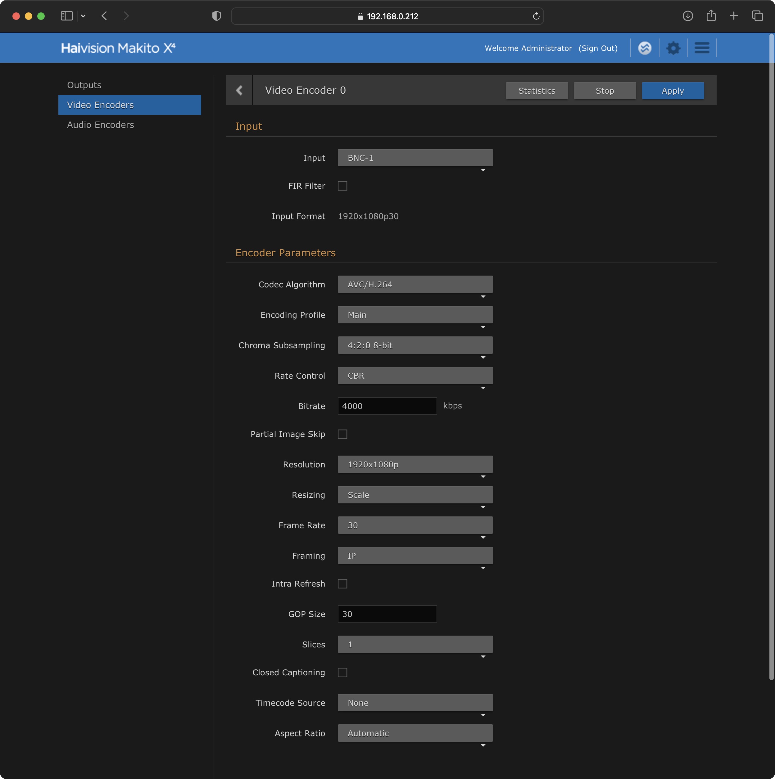 In the Haivision web interface we can set up our Video Encoder and confirm the incoming signal: