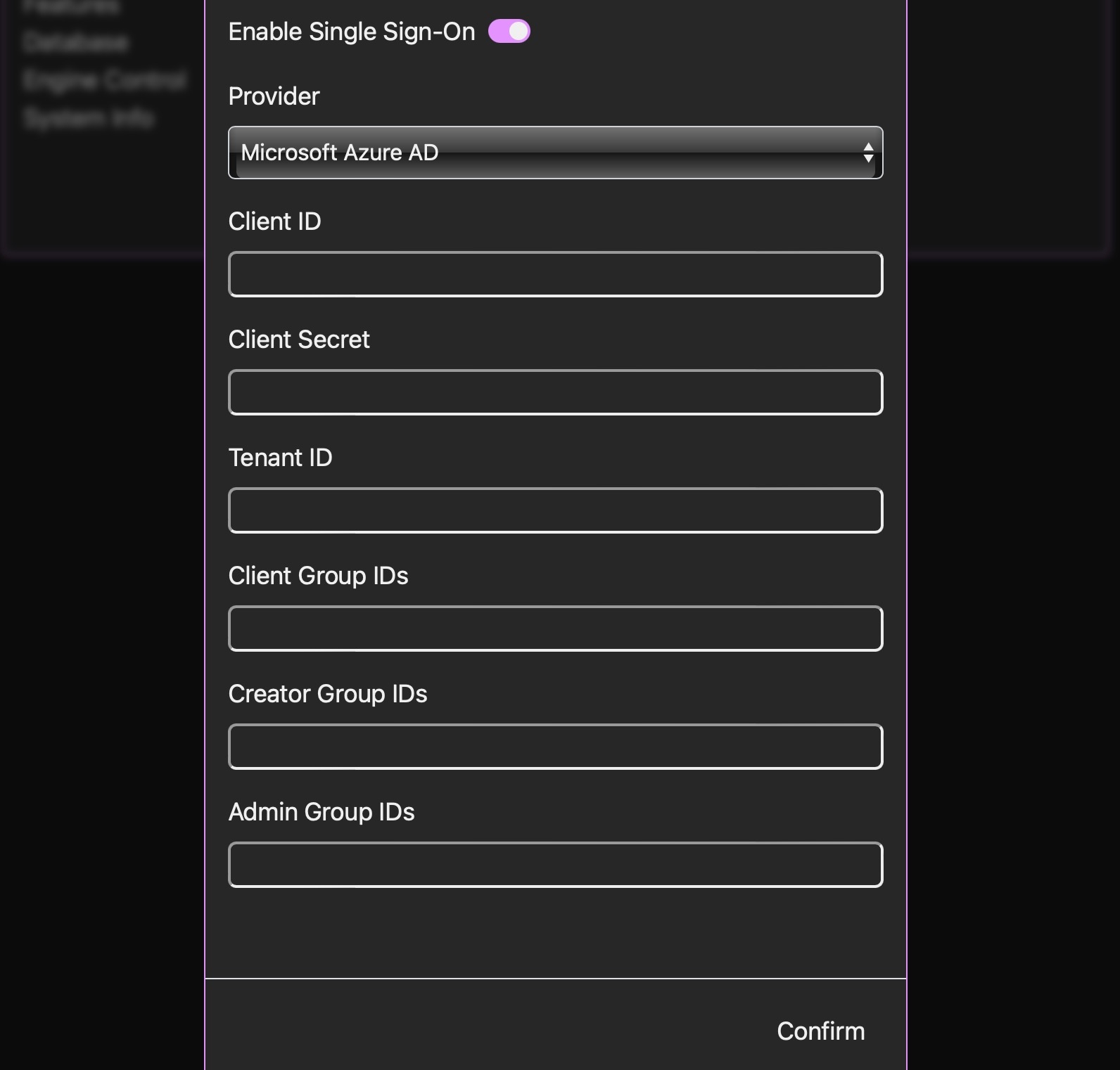Under Administration -> Server -> Features, an 'Enable Single Sign-On' option will appear if you have an Enterprise License. With this option enabled, paste in the appropriate IDs and secret from the previous steps, then hit 'Confirm'. If you want to map multiple groups to a role, separate the IDs with a comma e.g. "myid-1,myid-2,my-id-3".