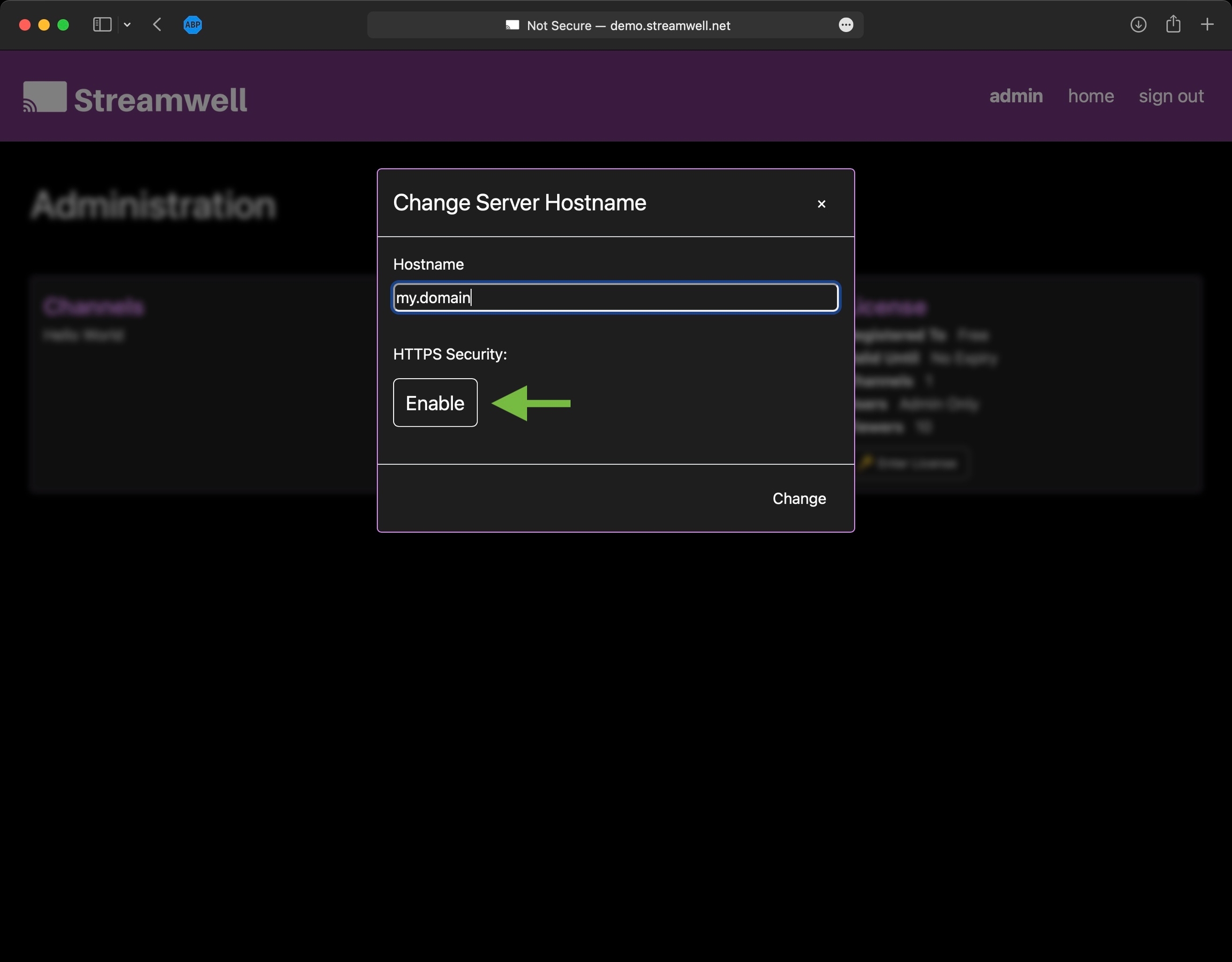 You can also do this when you are starting up the docker container for the first time, by passing environment variables for a 'STREAMWELL_DOMAIN_NAME' and 'STREAMWELL_DOMAIN_EMAIL'. Streamwell will automatically configure HTTPS for your server, assuming it is reachable over the internet at that domain name, at port 80.