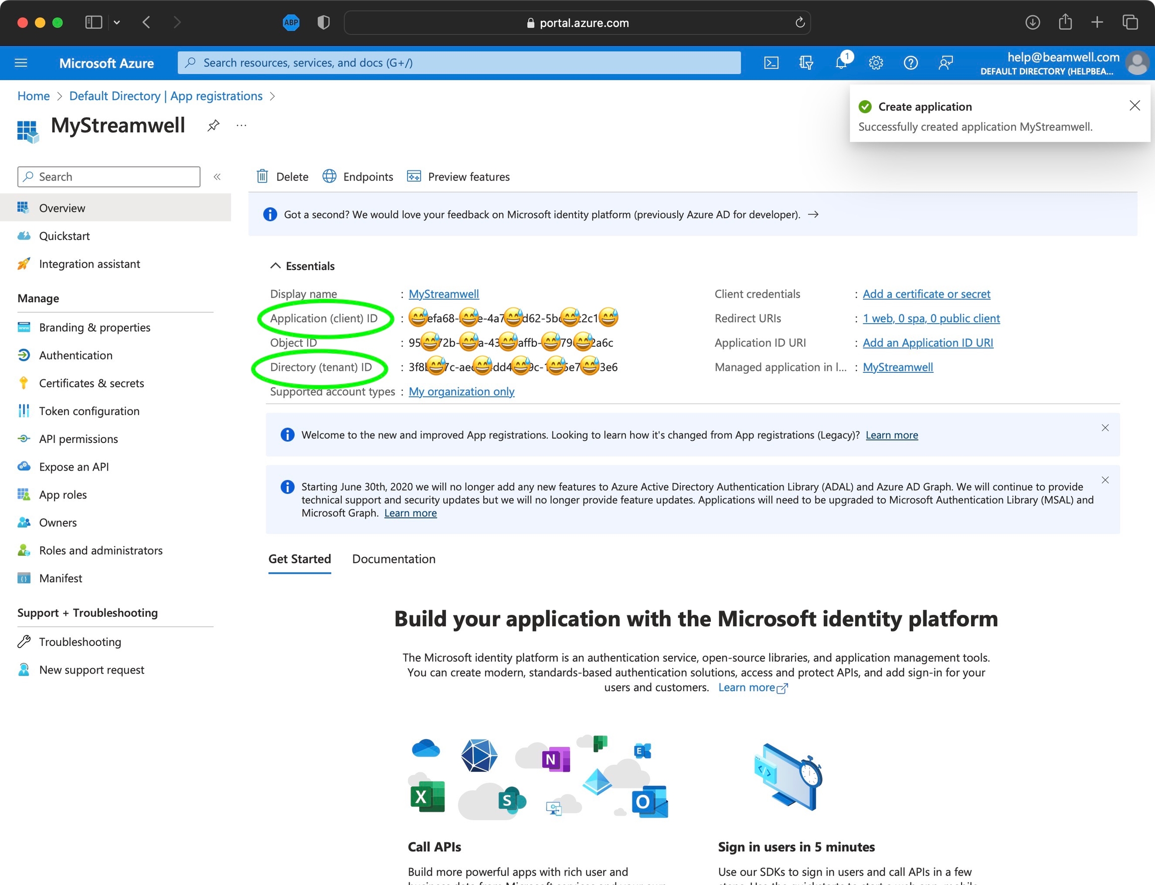 Once the application has been created, take note of the Client ID and Tenant ID from the overview screen.