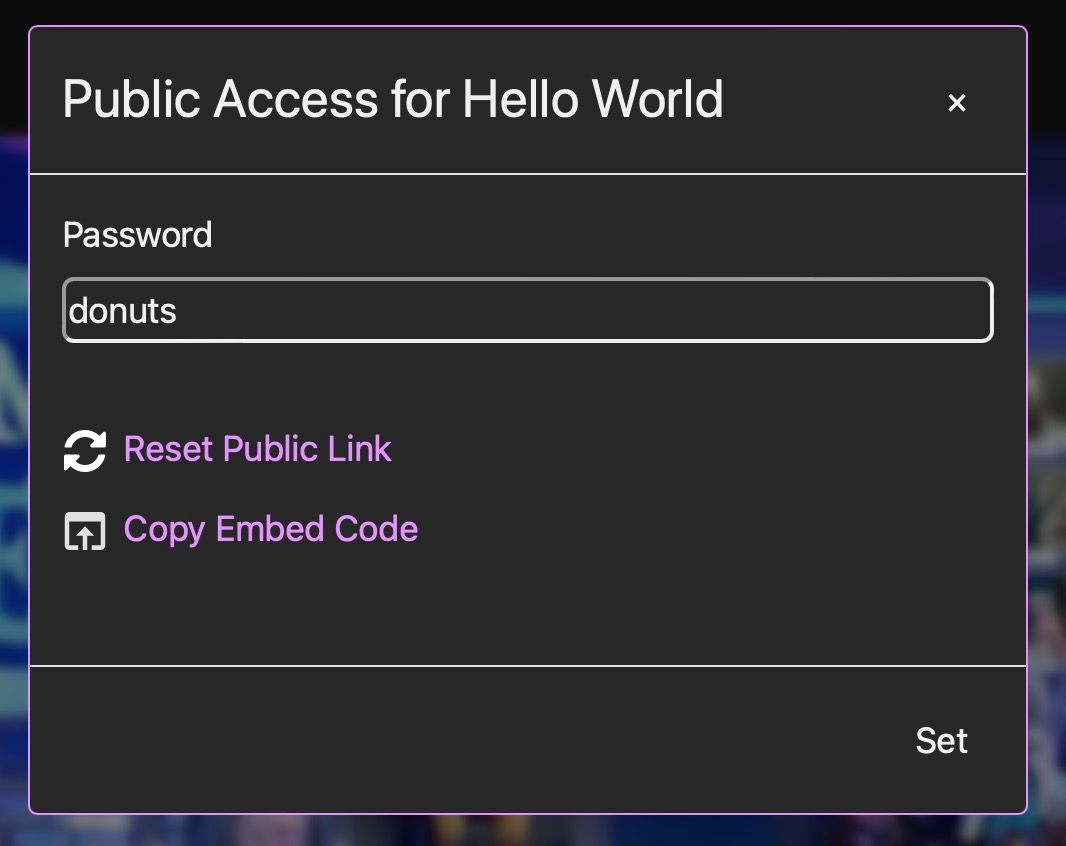 The Public Link can be copied to provide view-only access to the current stream, or within the options dialog you can click 'Copy Embed Code' to generate a small HTML snippet that can be copy-pasted into any other website if you prefer to show your stream there. Click 'Reset Public Link' and anybody watching will be elegantly dismissed, then a new public link will be generated: