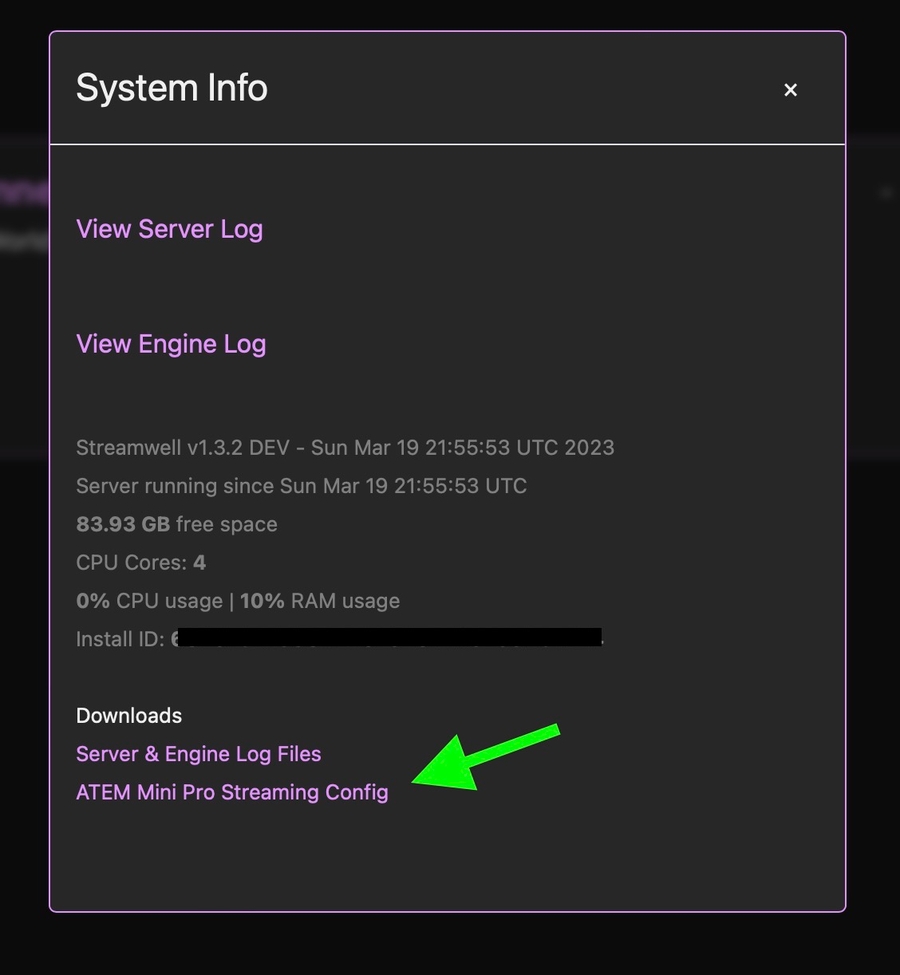 ATEM Mini Pro is a powerful and affordable video switcher from Blackmagic. To send a stream into Streamwell, you can download an auto-generated config file for the ATEM Mini Pro right from the Administration panel, under Manage -> Server -> System Info. To import the config file, choose Stream -> Load Streaming Settings in the ATEM Software Control app. This will enable RTMP or RTMPS streaming from the ATEM Mini Pro into Streamwell.