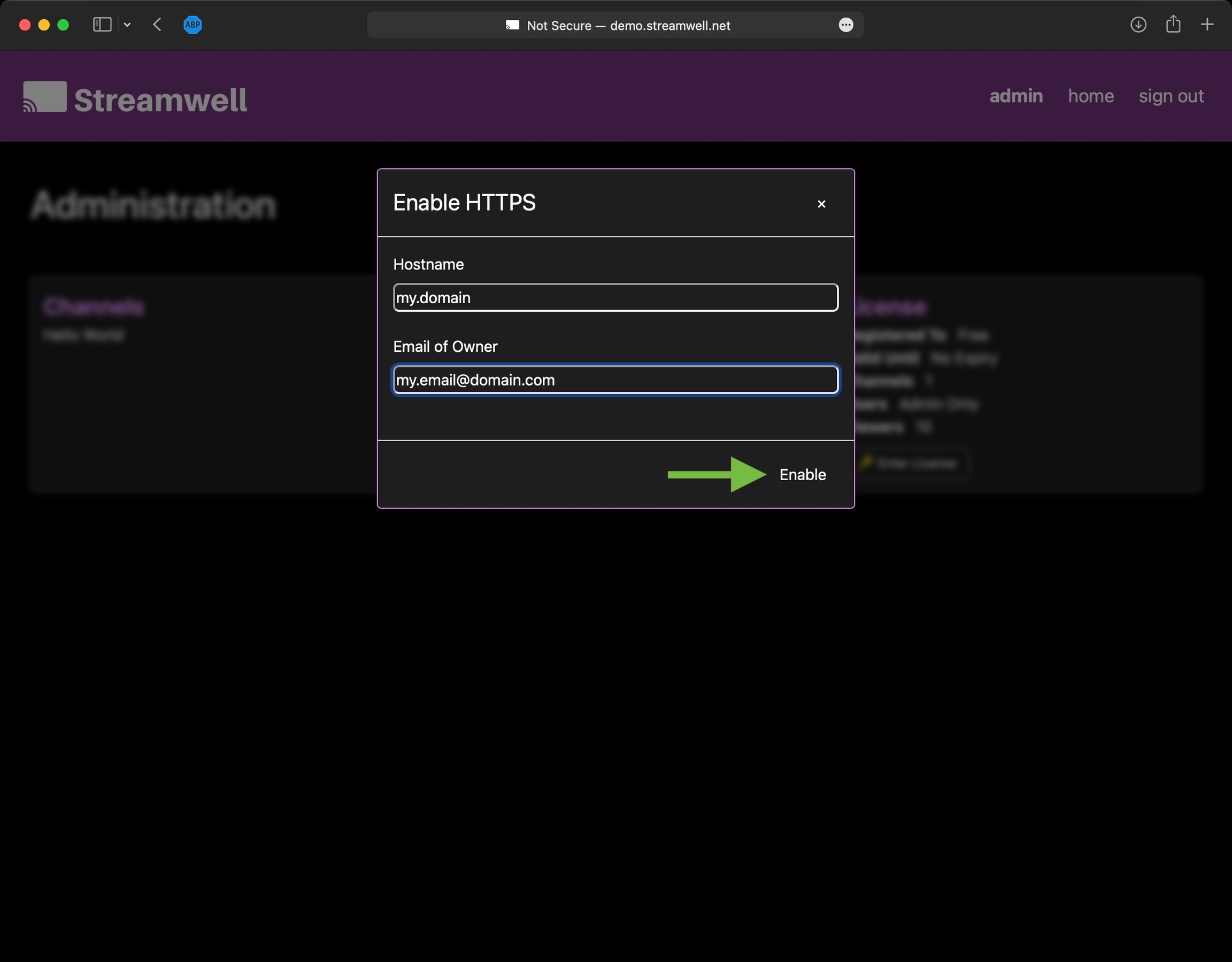 You can also do this when you are starting up the docker container for the first time, by passing environment variables for a 'STREAMWELL_DOMAIN_NAME' and 'STREAMWELL_DOMAIN_EMAIL'. Streamwell will automatically configure HTTPS for your server, assuming it is reachable over the internet at that domain name, at port 80.