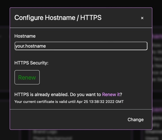 Once HTTPS is activated it will be valid for 90 days at a time. You will receive an automated email from LetsEncrypt when it is time to renew your certificate. To do so, simply come back to this panel and the Enable button will offer you to renew the certificate. When you enable HTTPS, the engine will restart and all streams will be disconnected for up to 30 seconds.