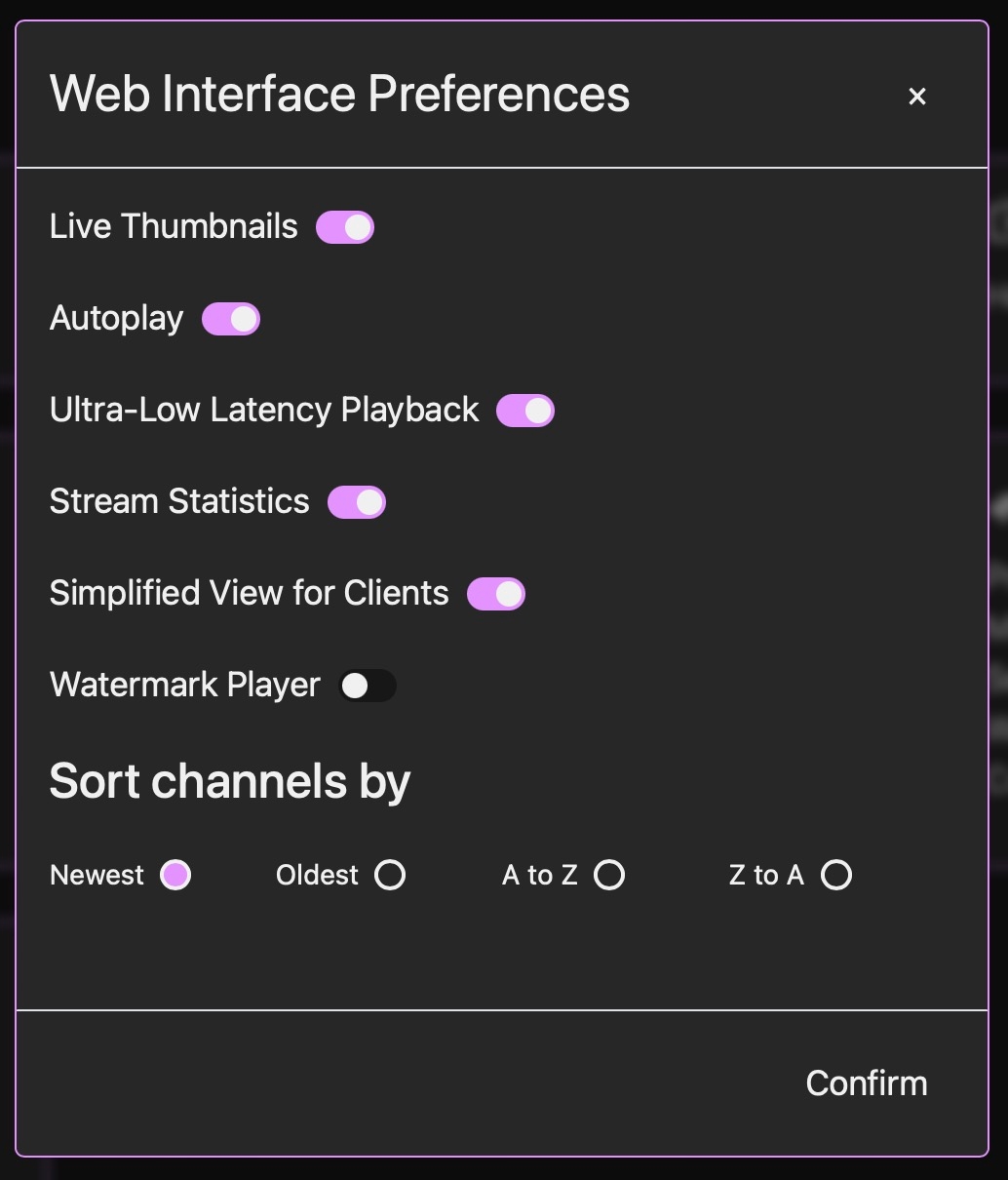The preferences panel lets you change the look and behaviour of the web interface. You can decide on visual features like live thumbnails on the home screen, whether to use WebRTC (Ultra-Low Latency) or HLS (less demanding, more compatible) for playback, watermarking options, the channel sort order, and whether clients see chat/file upload modules or just the stream.