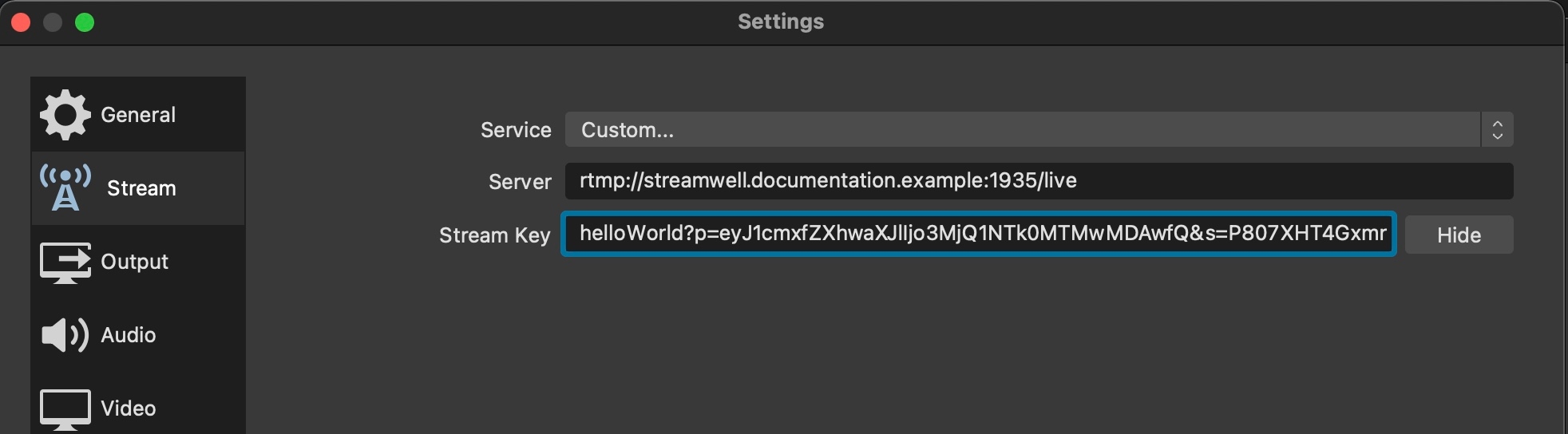 Enter your Server URL under Server, and copy/paste a Stream Key of your choosing for the channel you’d like to stream to. For SRT URLs just copy/paste the full URL in the 'Server' field and leave the 'Stream Key' field blank. For RTMP URLs the server URL is everything up to and including 'live', and the Stream Key is everything after the slash (do not include the "/" in the stream key). Within each channel there is a 'show' button next to the stream key which reveals these components already separated for an easy click-to-copy: