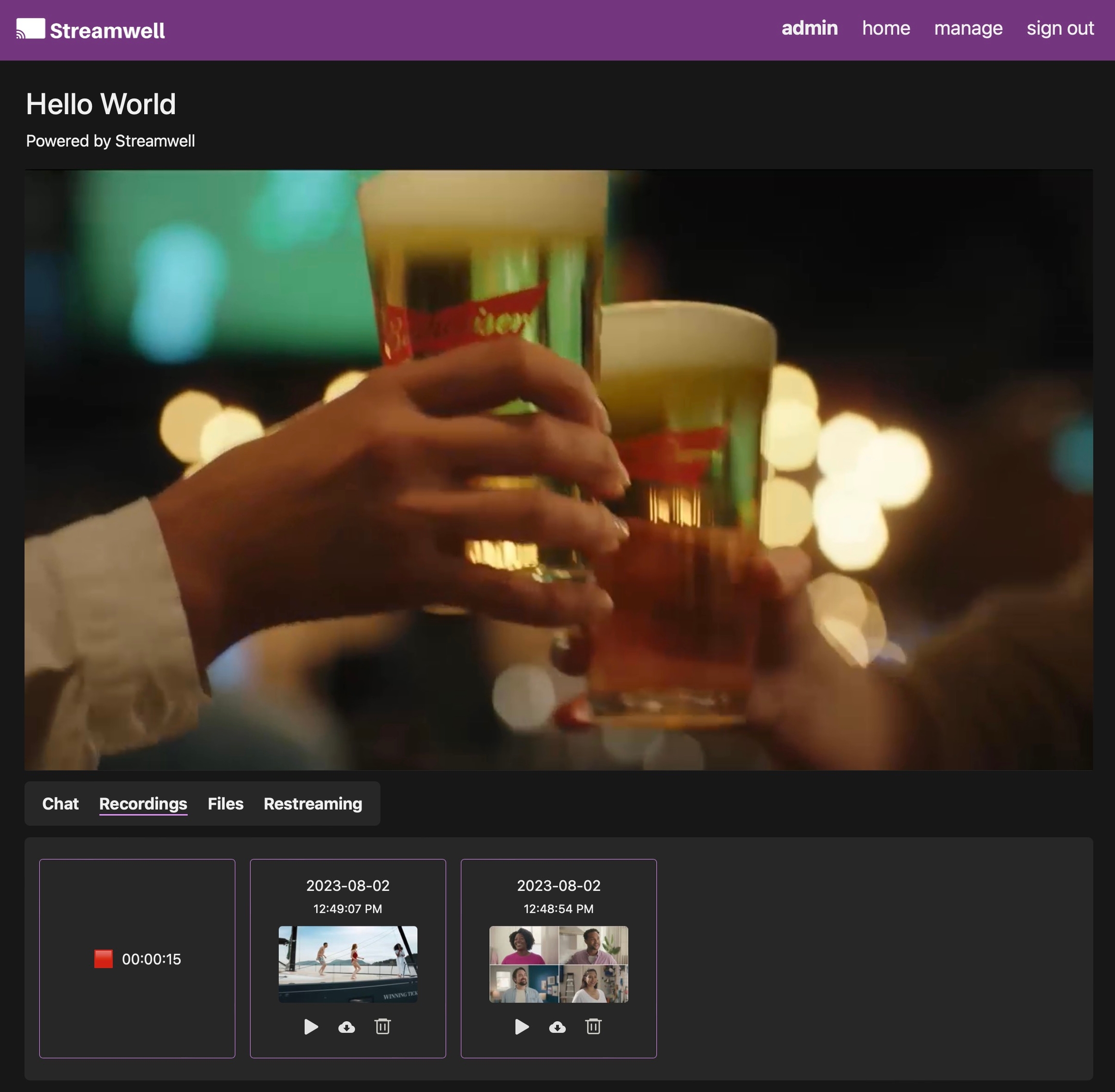 Note: A minimum of 8GB disk space is required to begin a recording. If you don't see a REC button, check that H.264 + AAC are the incoming stream codecs, you have enabled recordings in the Admin section, and of course that your stream is live!