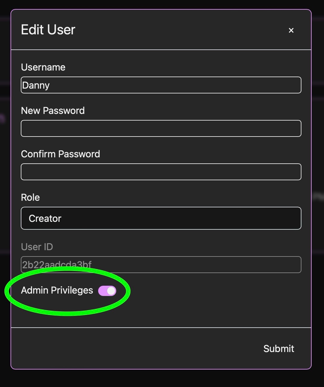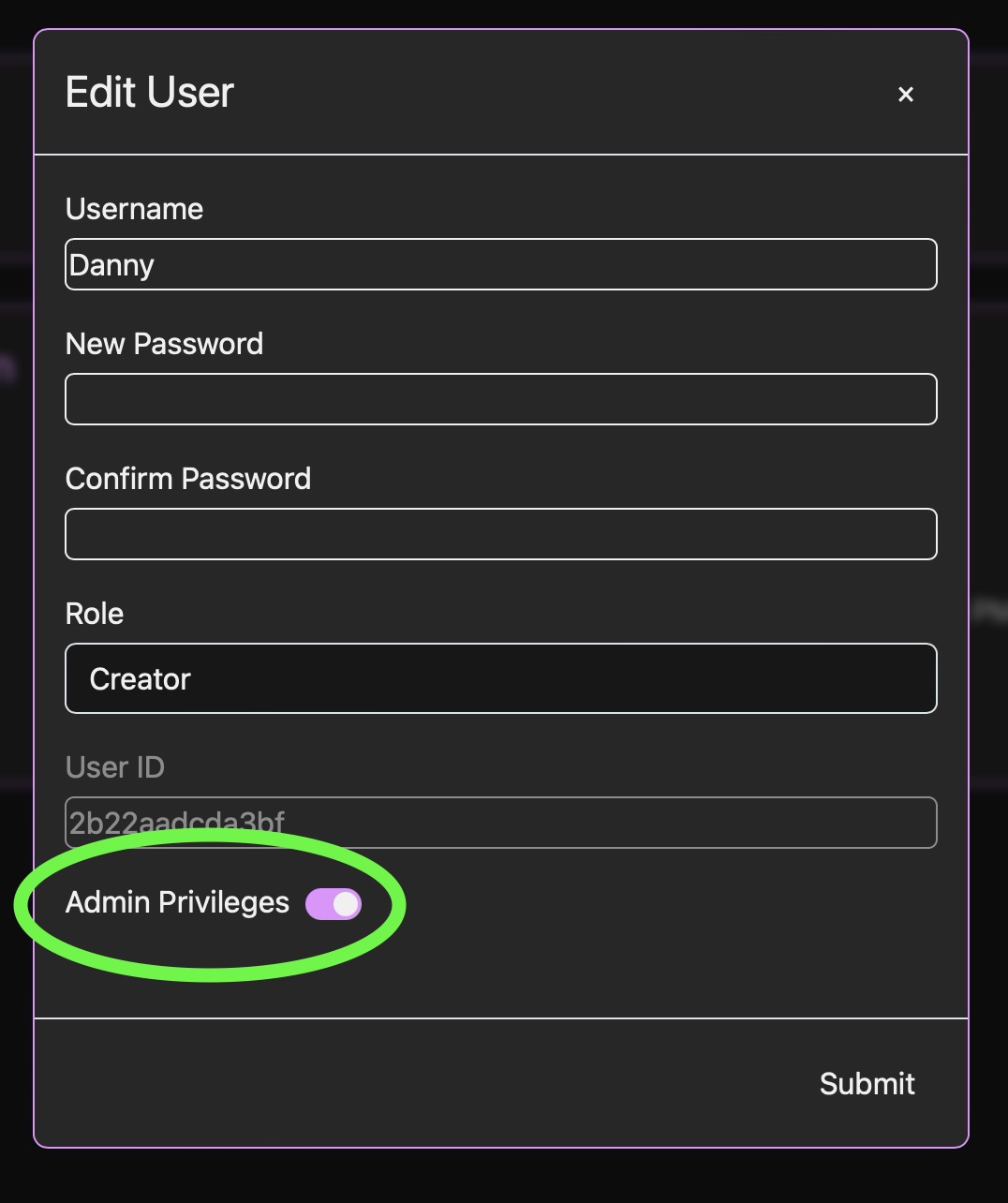 To promote a creator account, select it and toggle the 'Admin Privileges' option: