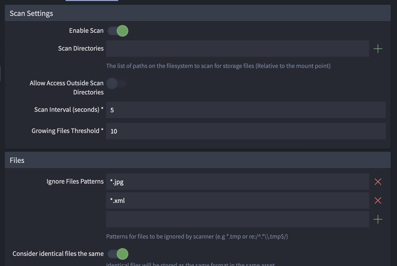 * Under Scan settings, create 'Ignore Files Patterns' as shown: "\*.jpg" and "\*.xml" - this will prevent the sidecar metadata and thumbnail files from being ingested as clips into Iconik (unless you want them there, in which case go nuts).