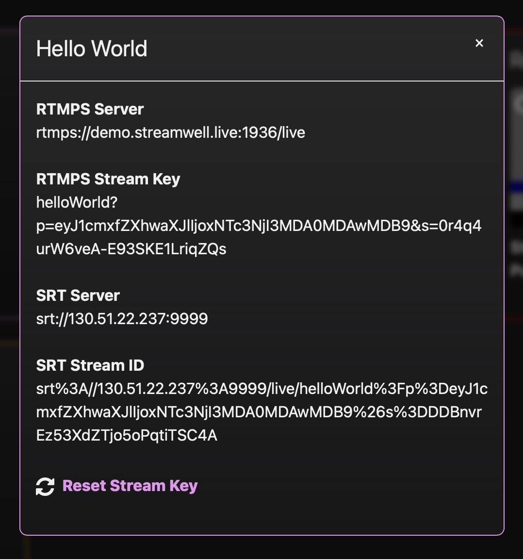 You can click 'RTMP', 'RTMPS', or 'SRT' to copy the full inbound stream URL and paste it into the 'Server' box in OBS. Or click the 'show' button next to the stream key which reveals the URL components already separated for an easy click-to-copy: