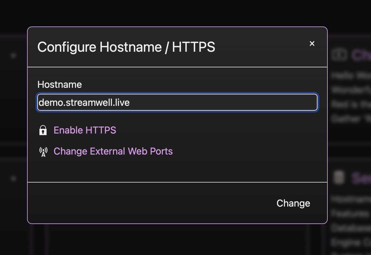 You can also do this when you are starting up the docker container for the first time, by passing environment variables for a 'STREAMWELL\_DOMAIN\_NAME' and 'STREAMWELL\_DOMAIN\_EMAIL'. Streamwell will automatically configure HTTPS for your server, assuming it is reachable over the internet at that domain name, at port 80.