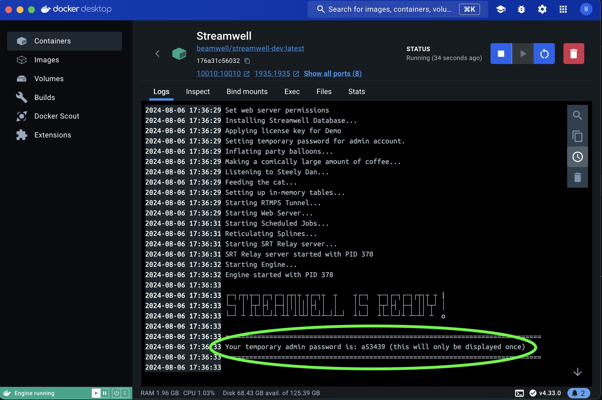 The first time you start Streamwell, it will generate a one-time admin password for your first login, at which time you will be required to change the admin password. The password is printed to the Docker logs which can be viewed by clicking the container name in Docker Desktop running this command after the installation completes: `docker logs -f Streamwell`