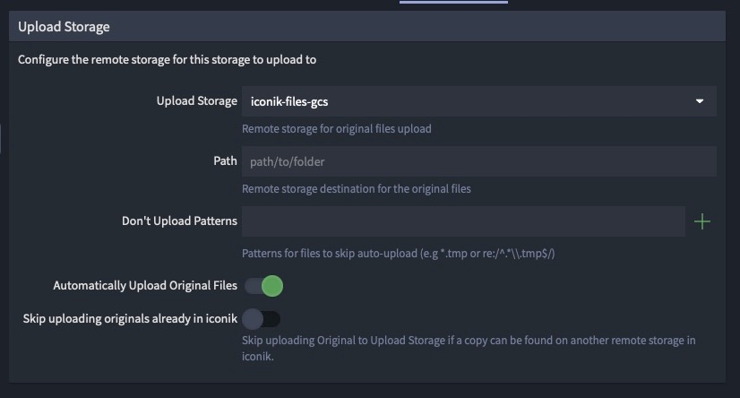 Under Upload storage, choose where you want your uploaded files to land (the default choice would be 'iconik-files-gcs') and you can also customize a folder path if you don't want them to just drop onto the root of the storage. Also make sure you enable 'Automatically Upload Original Files'.