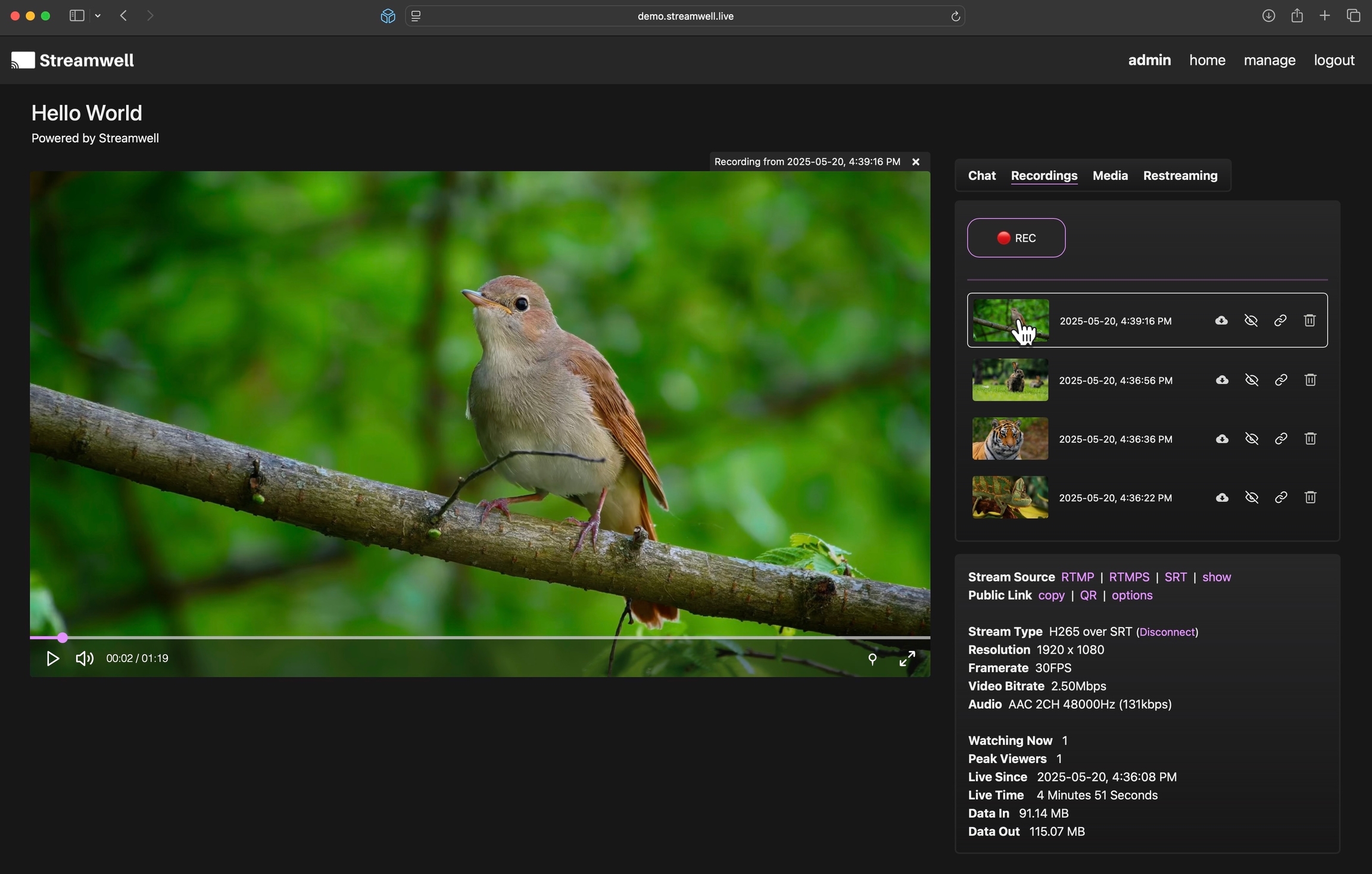 You are free to leave the page while the recording is active. When you stop the recording, it will create a thumbnail on the server and appear in the list after a few seconds. You can then playback recordings in the browser as you please, or download them for use elsewhere. The recordings are muxed into MP4 but not re-encoded, so the exact video data received by the server is what you will see in your recording. A minimum of 8GB disk space is required to begin a recording. If you don't see a REC button, check that you have enabled recordings in the Admin section, and of course that your stream is live!