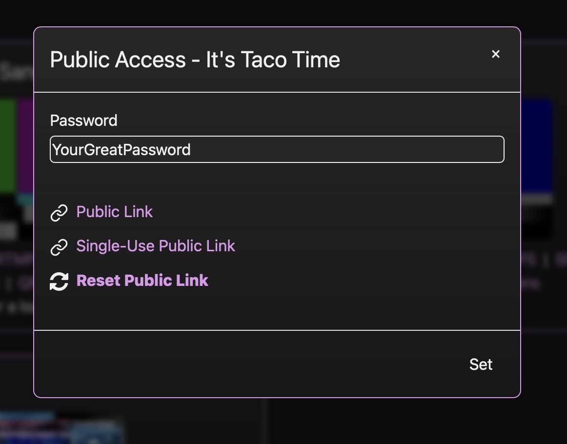 The Public Link can be copied to provide view-only access to the current stream, or within the options dialog you can click 'Copy Embed Code' to generate a small HTML snippet that can be copy-pasted into any other website if you prefer to show your stream there. Click 'Reset Public Link' and anybody watching will be elegantly dismissed, then a new public link will be generated: