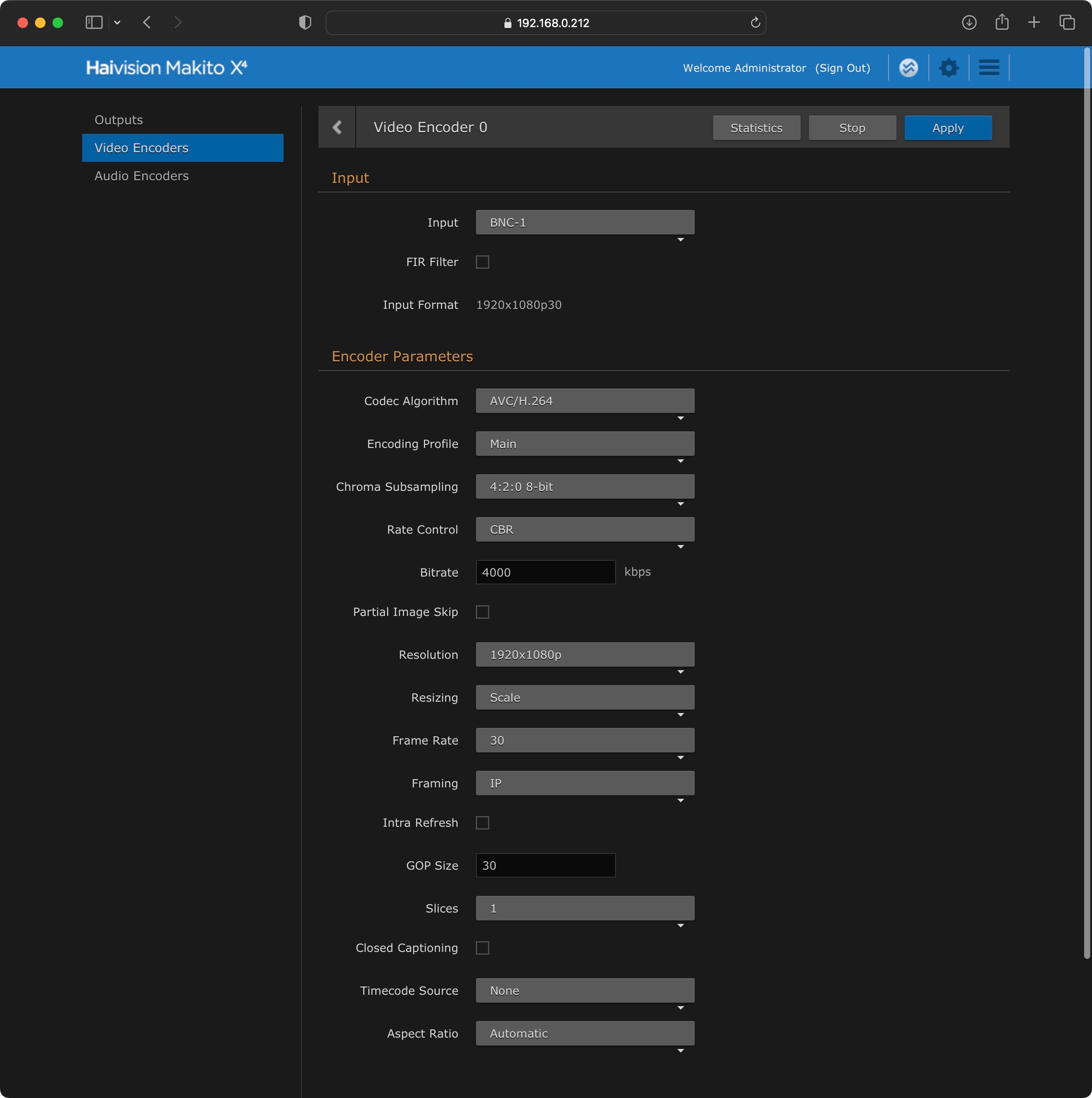 In the Haivision web interface we can set up our Video Encoder and confirm the incoming signal: