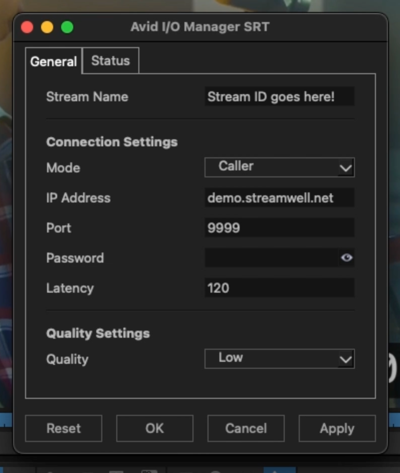 Port: Set to the SRT port of your Streamwell server (default is 9999).