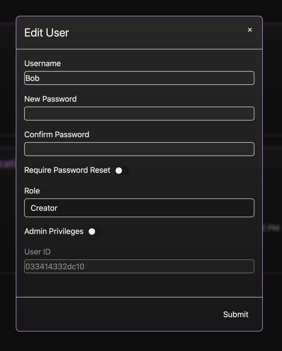 There is one top-level admin account for administration of users, channels and other server settings. Streamwell also lets you "promote" creator accounts to admins, granting them most of the day-to-day admin privileges required to manage users, channels and themes. Admins can also require users to reset their password on the next login.