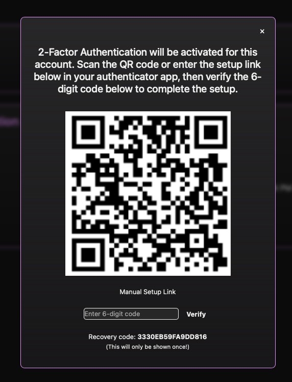 From here, use the QR code or manual setup link to configure your password manager of choice. Verify the code in the box at the bottom to confirm activation. Don't forget to copy the recovery code (click to copy)! Using the code in place of a one-time passcode will disable 2-factor authentication for that account.