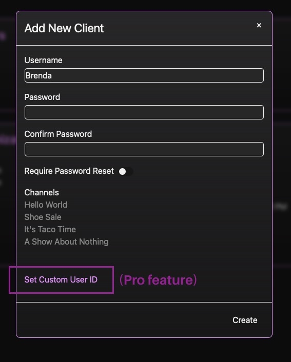 Use the + and - buttons to add and delete clients and creators, or click on a user to edit it: