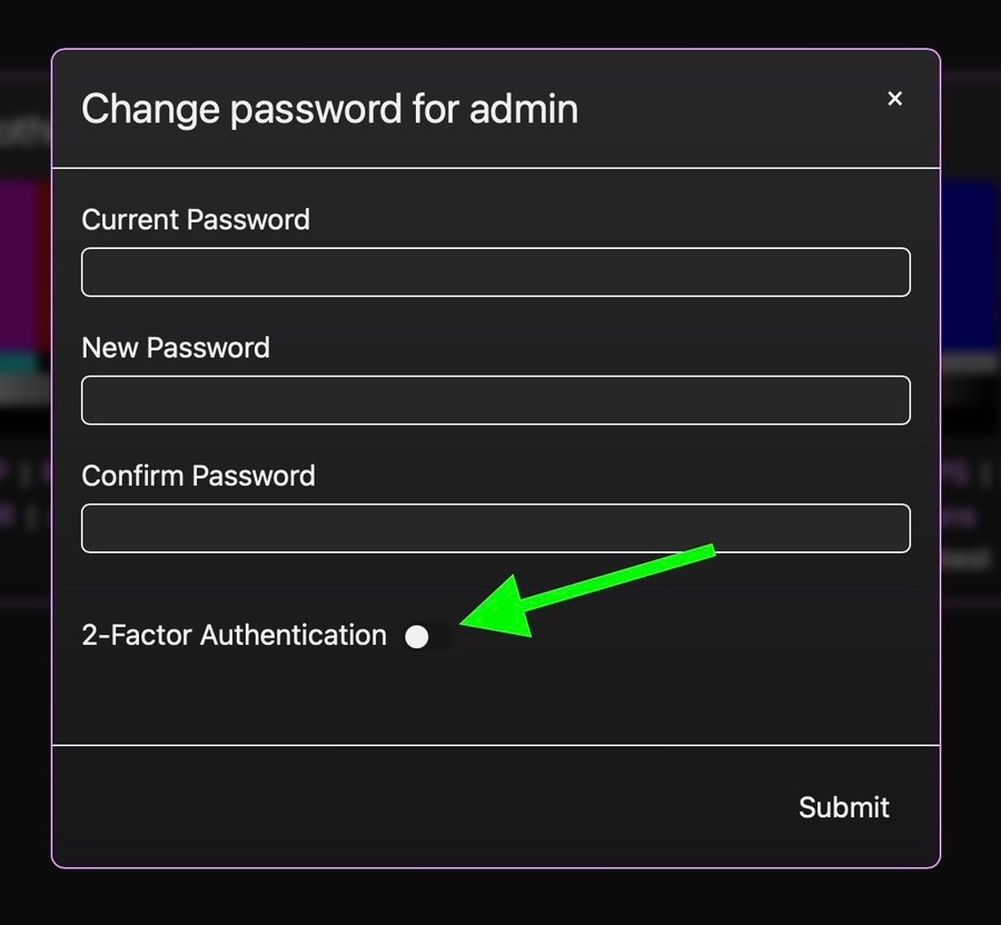 Configure 2-Factor authentication for any user account by clicking the user name at the top of the screen when logged in, then flipping the '2-Factor Authentication' switch: