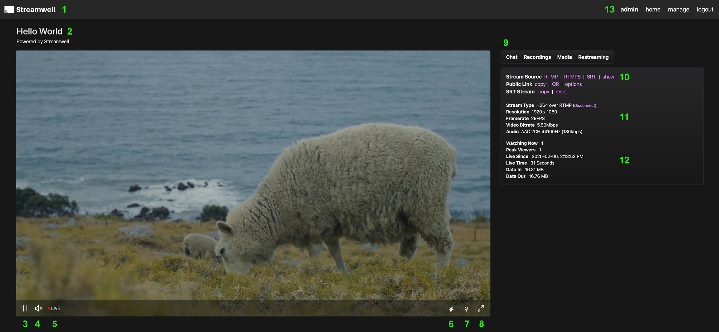 Note: Items 10-12 will be hidden from the stream page if "Stream Statistics" is deactivated in the Admin Preferences. They are always accessible from the home page.