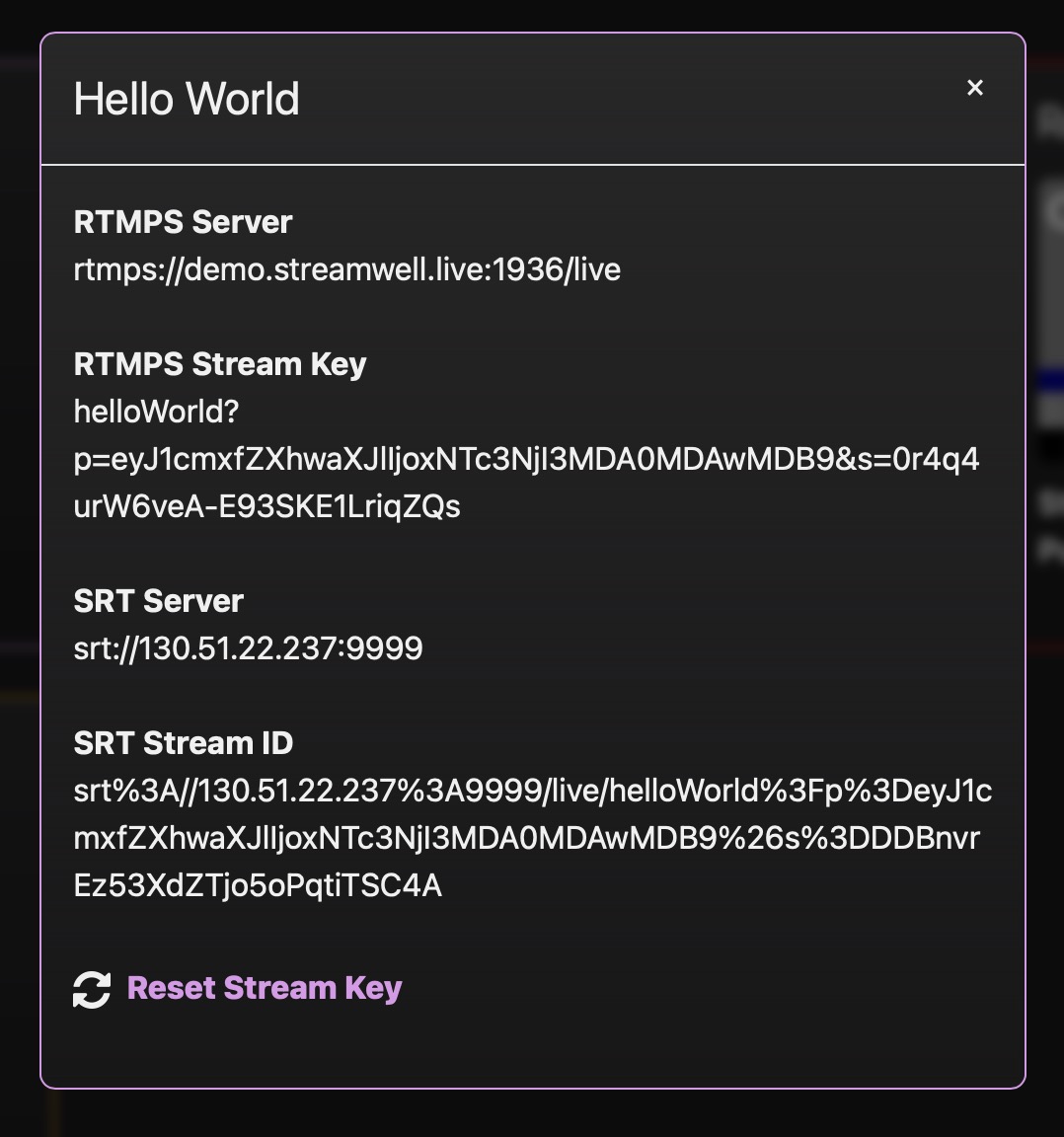 * You can click 'RTMP', 'RTMPS', or 'SRT' to copy the full inbound stream URL and paste it into the 'Server' box in OBS. Or click the 'show' button next to the stream key which reveals the URL components already separated for an easy click-to-copy: