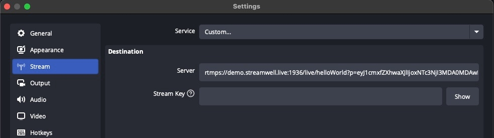 You can click 'RTMP', 'RTMPS', or 'SRT' to copy the full inbound stream URL and paste it into the 'Server' box in OBS. Or click the 'show' button next to the stream key which reveals the URL components already separated for an easy click-to-copy: