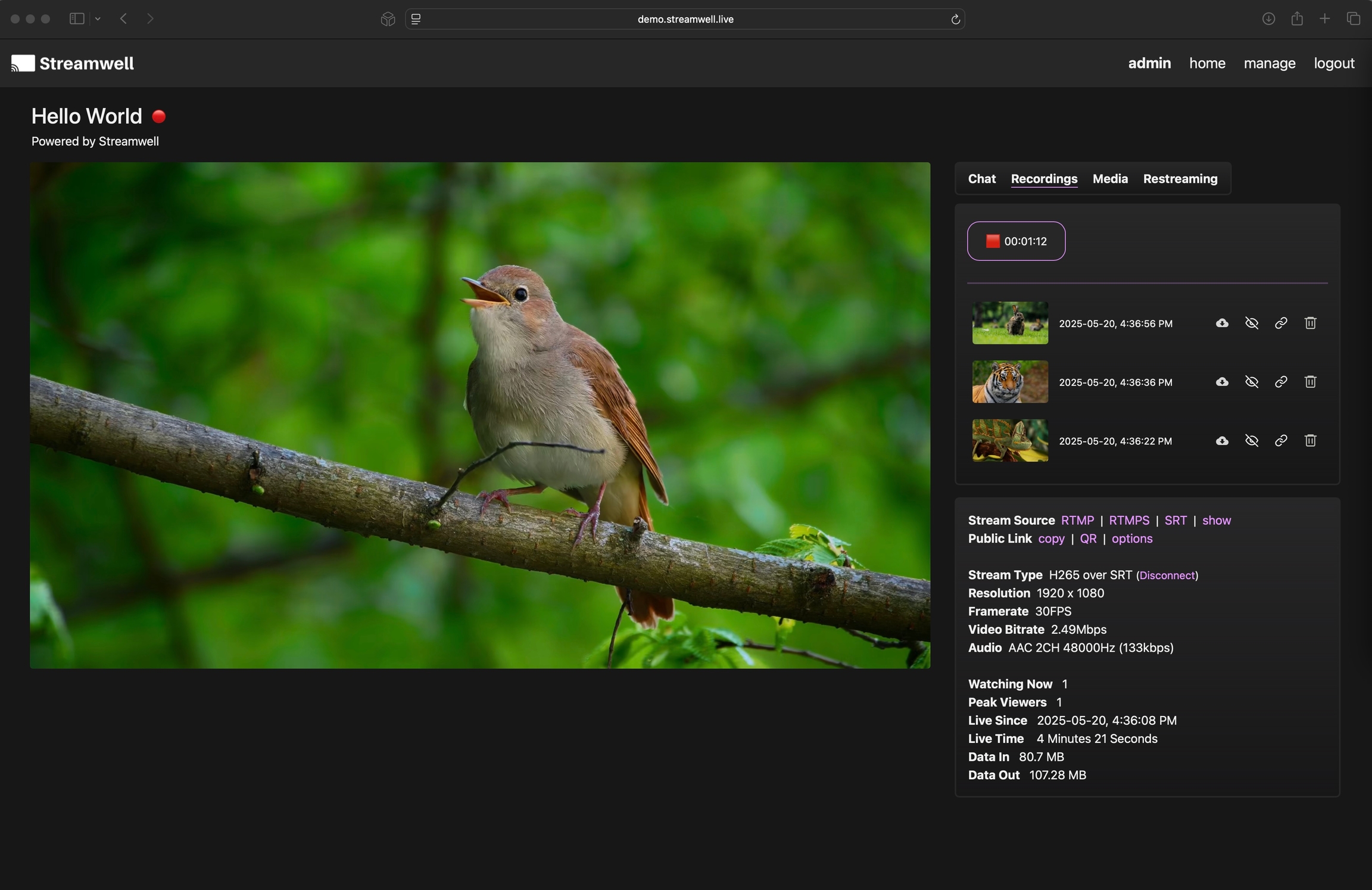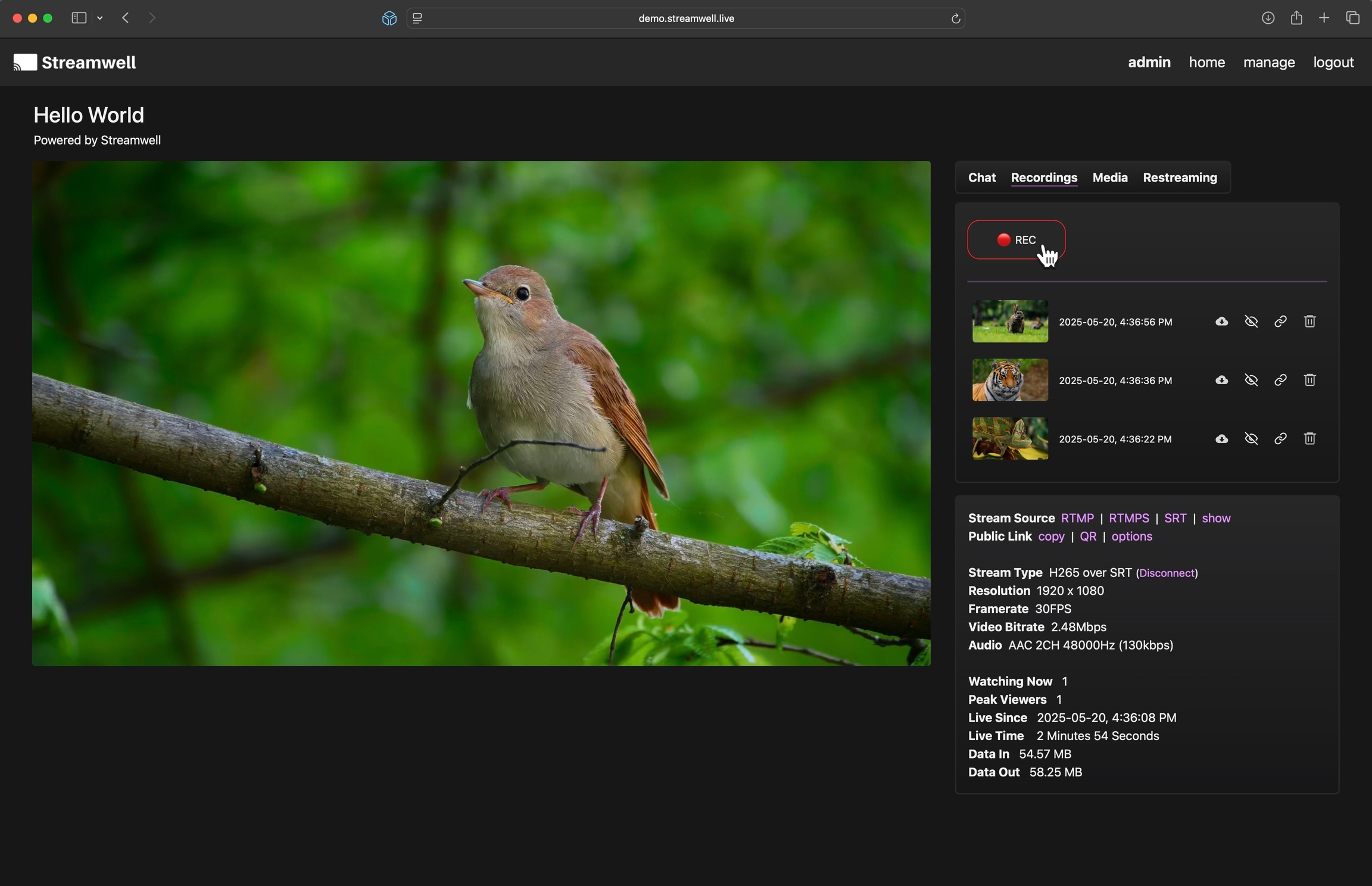 You are free to leave the page while the recording is active. When you stop the recording, it will create a thumbnail on the server and appear in the list after a few seconds. You can then playback recordings in the browser as you please, or download them for use elsewhere. The recordings are muxed into MP4 but not re-encoded, so the exact video data received by the server is what you will see in your recording. A minimum of 8GB disk space is required to begin a recording. If you don't see a REC button, check that you have enabled recordings in the Admin section, and of course that your stream is live!